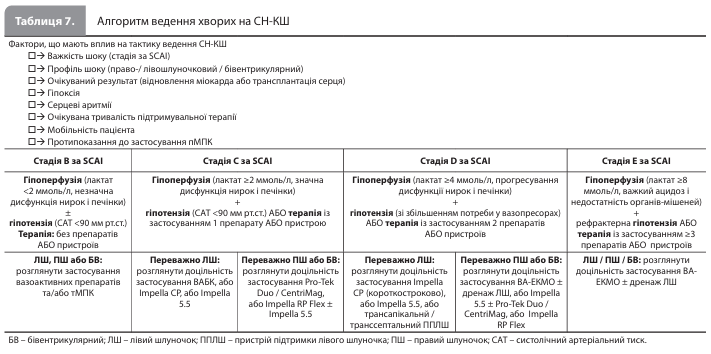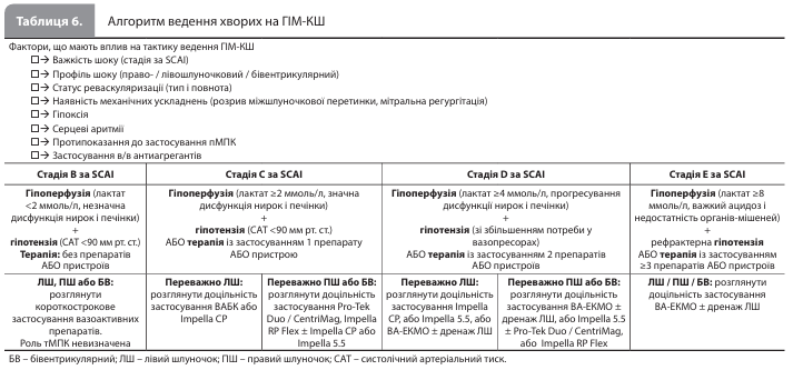Хоча тМПК все частіше використовується в лікуванні ГІМ-КШ і СН-КШ, рутинне застосування пристроїв у всіх пацієнтів із КШ настійно не рекомендується. Багатоцентрове рандомізоване відкрите дослідження IABPSHOCK (Intraaortic Balloon Pump in Cardiogenic Shock) II за участю 600 пацієнтів із ГІМ-КШ, які пройшли ранню реваскуляризацію, не виявило розбіжностей між групою внутрішньоаортальної балонної контрпульсації (ВАБК) і контрольною групою, яка отримувала стандартну терапію без ВАБК, за показником 30-денної загальної смертності та результатами 6-річного довгострокового спостереження. Схожі результати були отримані в багатоцентровому рандомізованому відкритому дослідженні ECLS-SHOCK (Extracorporeal Life Support in Infarct-Related Cardiogenic Shock) за участю 420 пацієнтів із ГІМ-КШ і ранньою реваскуляризацією, у яких додавання до фармакотерапії екстракорпоральної мембранної оксигенації (early extracorporeal life support, ECLS) не знижувало рівень 30-денної загальної смертності порівняно з терапією без ECLS. Водночас дослідження DanGer Shock вперше продемонструвало, що раннє (протягом перших 24 годин) використання мікроаксіального насоса в окремих пацієнтів із КШ, пов'язаним з ІМпST, здатне поліпшити 180-денну виживаність порівняно зі стандартним лікуванням: абсолютне зниження смертності становило 12,7%. Проте суворі критерії відбору учасників для DanGer Shock обмежують доказову базу на користь застосування цього пристрою невеликою когортою пацієнтів із КШ, викликаним ІМпST. Метааналіз даних окремих учасників рандомізованих клінічних досліджень із 6-місячним періодом спостереження показав, що в пацієнтів з ІМпST без ризику гіпоксичного ураження головного мозку використання тМПК, зокрема вено-артеріальної екстракорпоральної мембранної оксигенації (ВА-ЕКМО), асоціювалося зі зниженням смертності. Отже, робоча група вважає, що посилення терапії КШ із переходом до тМПК за допомогою мікроаксіального насоса може розглядатись у ретельно відібраних пацієнтів з ІМпST, КШ із переважним ураженням лівого шлуночка за наявності клінічно значущої гіпоперфузії та/або ознак погіршення гемодинаміки. Запропоновані робочою групою АСС стандартизовані алгоритми ведення хворих на ГІМ-КШ і СН-КШ представлені в таблицях 6 і 7.