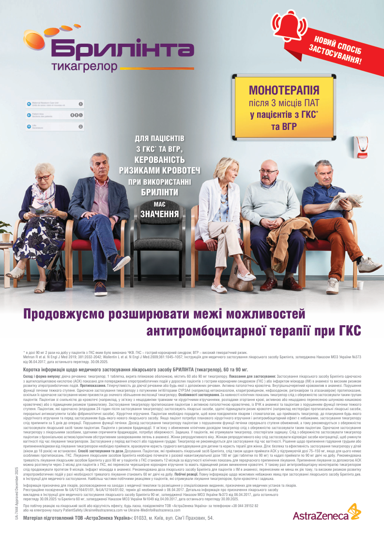 Підвищення статусу стратегії раннього переходу на монотерапію тикагрелором після ЧКВ: коментар фахівців до нової рекомендації АНА / АССОновлена настанова Американського коледжу кардіологів (АСС) та Американської асоціації серця (АНА) щодо ведення хворих на гострий коронарний синдром (ГКС) 2025 року внесла істотні зміни в парадигму вторинної профілактики серцево-судинних (СС) подій, представивши перехід на монотерапію тикагрелором вслід за місячною подвійною антиагрегантною терапією (ПАТ) у хворих після черезшкірного коронарного втручання (ЧКВ) як рекомендацію класу І (рівень доказовості А) [1]. Медична спільнота сприйняла це рішення неоднозначно, критикуючи завершені дослідження монотерапії інгібіторами P2Y12-рецепторів тромбоцитів (іP2Y12) за різнорідність дизайнів, переважну увагу до кровотеч і використання підходу «не менша ефективність» для оцінки ішемічних наслідків (тобто дослідження лише підтверджували, що за антиішемічним ефектом нова стратегія не поступається старій більше, ніж на заздалегідь задану невелику величину – межу не меншої ефективності [Δ]). Проте ця рекомендація є добре обґрунтованою й підкріплена переконливими клінічними даними, що ставить під сумнів усталену практику призначення 12-місячної ПАТ і, в ширшому сенсі, необхідність використання тривалої ПАТ за наявності альтернативних стратегій із кращим балансом між ризиком кровотечі та антиішемічним захистом. Колектив авторів Mehran et al. представив розгорнутий коментар із даними, що підтверджують обґрунтованість нової рекомендації АНА / АСС [2]. Протягом майже двох десятиліть річна ПАТ була стандартною стратегією ведення хворих після ГКС [3]. Уперше цей підхід вивчали в дослідженні CURE (Clopidogrel in Unstable Angina to Prevent Recurrent Events), яке показало значне зниження ризику комбінації «СС смерть / інфаркт міокарда (ІМ) / інсульт» за використання ПАТ клопідогрелем і ацетилсаліциловою кислотою (АСК) порівняно з монотерапією АСК у 12 562 пацієнтів із ГКС без підйому сегмента ST (ГКСбпST) [4]. Хоча перед групою дослідників CURE не стояло завдання ідентифікації оптимальної тривалості ПАТ, яка в цьому дослідженні тривала протягом 3–12 місяців (у середньому 9 місяців), згодом у настановах за стандартну була прийнята найбільша протестована тривалість, що дорівнювала 12 місяцям. Це рішення додатково підтримали результати досліджень TRITON-TIMI 38 (Trial to Assess Improvement in Therapeutic Outcomes by Optimizing Platelet Inhibition with Prasugrel–Thrombolysis in Myocardial Infarction 38) і PLATO (PLATelet inhibition and patient Outcomes), метою яких, однак, також була не оцінка варіантів тривалості ПАТ: вони порівнювали схеми ПАТ на основі прасугрелю і тикагрелору з ПАТ на основі клопідогрелю. Медіана тривалості ПАТ у дослідженнях TRITON-TIMI 38 і PLATO становила 15 і 9 місяців відповідно [3]. Численні подальші дослідження, що вже цілеспрямовано вивчали різні варіанти тривалості ПАТ, поставили під сумнів вибір терміну у 12 місяців, і все одно саме 12-місячна терапія довгий час була єдиною рекомендацією класу I для ПАТ у всіх практичних настановах. Тим часом, вдосконалення процедури ЧКВ і дизайну коронарних стентів, а також впровадження методів внутрішньосудинної візуалізації привели до значного зниження ризику тромбозу стента й поліпшення довгострокових СС результатів ЧКВ [5, 6]. Одночасно стало зрозуміло, що кровотечі значно й негативно впливають на прогноз пацієнтів після ГКС / ЧКВ, і це пост