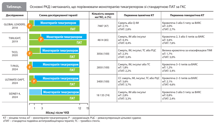 Цей підхід вивчався в численних рандомізованих клінічних дослідженнях (РКД) із використанням різних варіантів дизайну й залученням різних груп пацієнтів. У кожному із цих РКД скасування АСК і продовження монотерапії тикагрелором не призводили до зниження антиішемічного ефекту, але незмінно демонстрували більшу безпеку терапії, особливо серед пацієнтів із високим ризиком кровотечі та хворих на ГКС (табл.). Так, РКД GLOBAL LEADERS (A Clinical Study Comparing Two Forms of Anti-platelet Therapy After Stent Implantation), у якому майже 16 тис. пацієнтів були рандомізовані в групу переходу на монотерапію тикагрелором після 1 місяця ПАТ або в групу стандартної 12-місячної ПАТ [9], не виявило міжгрупових відмінностей за частотою первинної кінцевої точки (комбінація «смерть або Q-ІМ протягом 24 місяців»; відношення ризиків [ВР] 0,87; 95% довірчий інтервал [ДІ] 0,75–1,01; р=0,073), проте показало зниження частоти великих кровотеч у пацієнтів із ГКС, які перейшли на монотерапію, зокрема 48% зниження ризику великих кровотеч за період із 31-го по 365-й день спостереження [10, 11]. Згодом дані, зібрані в РКД GLOBAL LEADERS, повторно проаналізували в дослідженні GLASSY (n=7585), у якому для оцінки результатів використовували тільки підтверджені експертизою події. Цей аналіз показав, що за впливом на ризик первинної кінцевої точки ефективності монотерапія тикагрелором не тільки не поступалася стандартній ПАТ (ВР 0,85; 95% ДІ 0,72–0,99; р<0,001), а й навіть продемонструвала невелику перевагу (р=0,0456), а щодо ризику кровотеч – групи були в цілому зіставними, при цьому в пацієнтів із ГКС рання деескалація ПАТ привела до 24% зниження ризику кровотеч 3 або 5 типу за класифікацією Академічного консорціуму з вивчення кровотеч (BARC; 2,27 vs 3,00%; ВР 0,76; 95% ДІ 0,51–1,12) [12, 13].