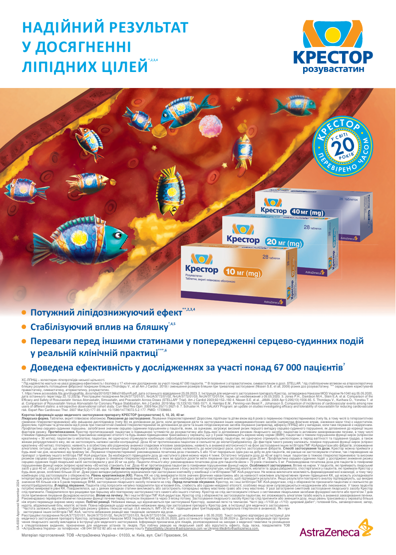 Розувастатин – це інгібітор 3-гідрокси-3-метилглутарил ко-А редуктази (статин), який значно знижує рівень ХС ЛПНЩ, підвищує рівень ХС ЛПВЩ, покращує інші параметри ліпідного профілю [2] і тому активно використовується для корекції різних варіантів атерогенних дисліпідемій протягом останніх 20 років. Основу наукової бази даних про ефекти розувастатину склали результати міжнародної програми клінічної розробки препарату, яка охопила 20 000 пацієнтів із широким спектром дисліпідемій, зокрема гіперхолестеринемією (ГХ) IIa/IIb типу, гетерозиготною або гомозиготною сімейною ГХ і гіпертригліцеридемією IIb або IV типу (за Фредріксоном). Крім того, у програмі розробки препарату були добре представлені літні пацієнти (31% учасників старших за 65 років і 7% – старших за 75 років), а також хворі з нирковою недостатністю (53%), артеріальною гіпертензією (52%), серцево-судинними (СС) захворюваннями (36%) і цукровим діабетом (17%) [3].