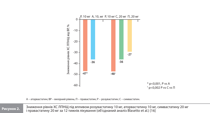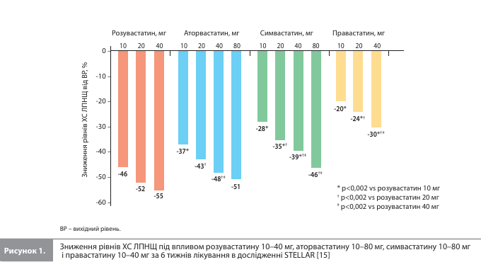 Ефективність розувастатину в корекції дисліпідемії ХС ЛПНЩ. Згідно з даними КД за участю пацієнтів із ГХ, розувастатин сприяє швидкому й вираженому зниженню рівня ХС ЛПНЩ у сироватці крові. Так, в одному з перших КД розувастатину (6-тижневе дослідження з підбору дози, Olsson et al.) дози 10–40 мг (n=63) забезпечували статистично значуще дозозалежне зниження рівня ХС ЛПНЩ на 52–63% порівняно з плацебо (n=29). В іншому 6-тижневому КД при ГХ (Schneck et al.), у якому порівнювали ефекти різних доз розувастатину й аторвастатину, розувастатин у дозах 10–40 мг (n=129) знизив рівень ХС ЛПНЩ на 47–57%, а аторвастатин у дозах 10–80 мг (n=165) – на 38–54%; дозозалежна відповідь у вигляді зниження концентрації ХС ЛПНЩ була сильніше виражена в групі розувастатину (p<0,001) [14]. Наступне 6-тижневе порівняльне КД STELLAR (Statin Therapies for Elevated Lipid Levels Compared Across Doses to Rosuvastatin) показало, що в зниженні ХС ЛПНЩ при ГХ розувастатин 10–40 мг (n=480; зниження ХС ЛПНЩ на 46–55%) ефективніший за аторвастатин 10–80 мг (n=641; зниження ХС ЛПНЩ на 37–51%), симвастатин 10–80 мг (n=655; зниження ХС ЛПНЩ на 28–46%) і правастатин 10–40 мг (n=492; зниження ХС ЛПНЩ на 20–30%) (рис. 1) [15]. І знову порівняння ефектів еквівалентних за активністю доз (перерахунок на мг-еквівалент) показало, що розувастатин знижує рівень ХС ЛПНЩ ефективніше за інші статини (p<0,002) [15]. Результати більш тривалих порівняльних КД підтвердили початкові дані. Загалом п'ять КД порівнювали ефекти 12-тижневої терапії розувастатином 10 мг з ефектами аторвастатину 10 мг (3 дослідження), симвастатину 20 мг та/або правастатину 20 мг (2 дослідження) при ГХ [16]. Об'єднаний аналіз результатів цих КД, проведений Blasetto et al., показав, що зниження рівнів ХС ЛПНЩ на тлі розувастатину 10 мг, аторвастатину 10 мг, симвастатину 20 мг і правастатину 20 мг становило 47–48, 36, 36, 27% відповідно (p<0,001 для всіх порівнянь розувастатину з іншими статинами; рис. 2) [1]. Ще у двох КД тривалість статинотерапії становила 52 тижні, причому перші 12 тижнів учасники із ГХ приймали фіксовані дози препаратів (розувастатин 10 мг, аторвастатин 10 мг, симвастатин 20 мг або правастатин 20 мг), після чого дозу можна було збільшити (до 80 мг для розувастатину, аторвастатину і симвастатину і до 40 мг для правастатину), щоб досягти цільових значень ХС ЛПНЩ [17–19]. Аналіз 12-тижневих даних (період приймання фіксованих доз) показав, що зниження рівня ХС ЛПНЩ становило 47–50% для розувастатину 10 мг порівняно з 39, 35 і 37% для аторвастатину 10 мг, симвастатину 20 мг і правастатину 20 мг відповідно (p<0,001 для всіх порівнянь) [17–19]. В аналізі результатів, досягнутих за 52 тижні, відповідні значення становили 48–53% для розувастатину 10–80 мг, 44% для аторвастатину 10–80 мг, 38% для симвастатину 20–80 мг і 32% для правастатину 20–40 мг (p<0,001 для всіх порівнянь) [3].