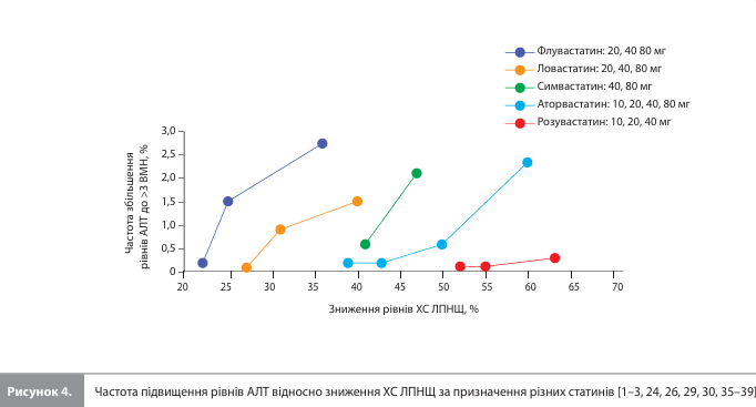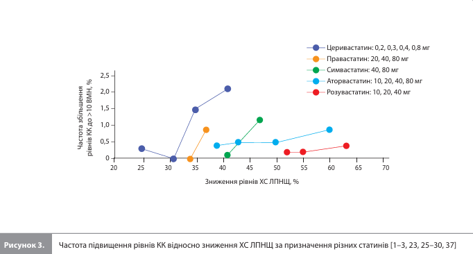 Безпечність терапії розувастатином Переносимість статинів як класу оцінюється як дуже хороша з низькою частотою розвитку серйозних побічних ефектів [32]. З огляду на механізм дії статинів та їхній вплив на ліпідний обмін, оцінка безпечності була спрямована насамперед на зміни в м'язах і печінці. Загалом для класу статинів ризики міопатії (0,1%) і гепатотоксичності (підвищення рівнів ферментів печінки; 1–2%) вважаються низькими, тоді як міалгія розглядається як частий побічний ефект статинотерапії (5–7%) [33, 34]. Для м’язових побічних ефектів зафіксована залежність від дози статину, до того ж ризик міопатії може збільшуватися при супутньому застосуванні препаратів, що використовують спільні зі статинами метаболічні шляхи [33]. Оцінка безпечності, проведена в рамках програми клінічної розробки розувастатину, показала такі результати. У контрольованих дослідженнях із застосуванням фіксованих доз 10–40 мг переносимість розувастатину була доброю, а профіль побічних ефектів був аналогічний профілям аторвастатину в дозах 10–80 мг, симвастатину в дозах 10–80 мг і правастатину в дозах 10–40 мг. Побічні ефекти, що призвели до скасування терапії, були зареєстровані у 2,9% пацієнтів на розувастатині (n=3074), 3,2% пацієнтів на аторвастатині (n=2899), 2,5% пацієнтів на симвастатині (n=1457) і у 2,5% пацієнтів на правастатині (n=1278) [3]. Найчастішими побічними ефектами розувастатину були міалгія, астенія, нудота й біль у животі; ці явища були, як правило, легкими й транзиторними. Жоден випадок смерті не був пов’язаний із прийманням розувастатину [1]. Під час приймання доз 10–40 мг міопатія (поєднання м’язових симптомів із підвищенням рівня креатинкінази [КК] у сироватці в >10 разів від верхньої межі норми [ВМН]), пов’язана з розувастатином, була зареєстрована у ≤0,03% пацієнтів. Випадки рабдоміолізу були відсутні. Частота клінічно значущого (>3 х ВМН за результатами ≥2 послідовних вимірювань) підвищення рівня аланінамінотрансферази (АЛТ) серед пацієнтів, які отримували розувастатин (n=8190), аторвастатин (n=3749) і симвастатин (n =2398) у дозах до 80 мг або правастатин у дозах до 40 мг (n=1260), становила 0,2%. Моніторинг рівня білка в сечі (за допомогою тест-смужок) рідко реєстрував значущу протеїнурію: за період спостереження перехід результату з категорії «нульове / слідове значення» в категорію «≥2+» було зареєстровано в <1,0% пацієнтів, які отримували розувастатин 10–20 мг або будь-які досліджувані дози аторвастатину, симвастатину або правастатину, і в <1,5% пацієнтів, які отримували розувастатин 40 мг. Протеїнурія була переважно транзиторною, мала канальцеве походження і не була пов’язана з розвитком гострої або прогресуванням хронічної ниркової недостатності. Середній рівень креатиніну в сироватці на тлі приймання розувастатину 10–40 мг залишався незмінним або знижувався порівняно з вихідними значеннями, у тому числі під час тривалої терапії (48 або 96 тижнів), а також у хворих із легкою або середньотяжкою нирковою недостатністю [3]. Результати 52-тижневих КД підтверджують хорошу переносимість розувастатину [17, 18]. В обох тривалих КД профіль безпечності розувастатину не відрізнявся від такого в препаратів порівняння; протягом цих КД не було зареєстровано жодного випадку міопатії. На рисунках 3 і 4 представлено графічне зображення результатів оцінки співвідношення «користь/ризик», що опису