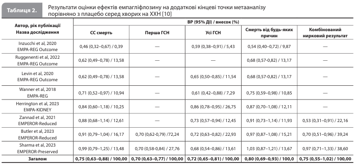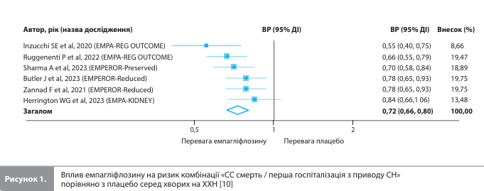 Вплив емпагліфлозину на серцево-судинні наслідки в пацієнтів із хронічною хворобою нирок: результати систематичного огляду й метааналізуХронічна хвороба нирок (ХХН) широко поширена в загальній популяції (поширеність понад 10%) і часто поєднується із серцево-судинними (СС) та обмінними захворюваннями, зокрема із серцевою недостатністю (СН) i цукровим діабетом 2 типу (ЦД2) [1]. У коморбідних пацієнтів ХХН додатково збільшує СС захворюваність і смертність [2], а також ризик небажаних ниркових наслідків, включно з термінальною стадією ниркової недостатності, що вимагає діалізу або трансплантації нирки [3]. Крім негативного впливу на прогноз пацієнтів, ХХН створює істотне навантаження на систему охорони здоров’я внаслідок інтенсивного витрачання фінансових і матеріальних ресурсів [4, 5], що пояснює високу потребу в терапевтичних підходах, які поліпшують клінічні результати в пацієнтів із ХХН [6]. Для хворих, у яких ХХН поєднується із СН та/або ЦД2, таким підходом може бути застосування інгібіторів натрійзалежного котранспортера глюкози 2 типу (іНЗКТГ2), наприклад емпагліфлозину, який, за даними досліджень, знижує смертність, зменшує ризик СС і ниркових ускладнень та сповільнює прогресування ниркової дисфункції в таких пацієнтів [7–9]. Проте наявна інформація про вплив дисфункції нирок на СС ефекти емпагліфлозину є досить суперечливою, що спонукало Foroutan et al. провести систематичний огляд і метааналіз основних клінічних досліджень емпагліфлозину з акцентом на СС ефекти лікування у хворих на ХХН [10].