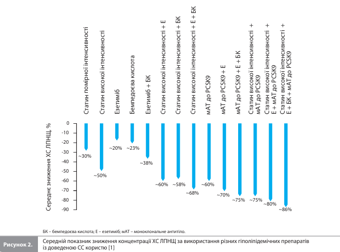 Комбінована та нестатинова ГЛТ В оновленій настанові представлені результати дослідження EWTOPIA 75, що підтверджують зниження СС ризику на тлі монотерапії езетимібом у літніх людей віком ≥75 років без ішемічної хвороби серця. У якості загальної концепції рекомендується включати в схему лікування нестатинові препарати з доведеною СС користю (наприклад, езетиміб, антитіла до PCSK9 або бемпедоєву кислоту, окремо або у вигляді комбінації) для зниження рівня ХС ЛПНЩ, якщо цільові значення ХС ЛПНЩ недосяжні при використанні максимальної переносимої дози статинів. Вибір препарату має ґрунтуватися на необхідній величині додаткового зниження ХС ЛПНЩ, уподобаннях пацієнта, доступності й вартості препарату. Бемпедоєва кислота – це відносно новий нестатиновий гіполіпідемічний препарат, що пригнічує синтез ХС шляхом інгібування ферменту АТФ-цитратліази. Бемпедоєва кислота є сполукою-попередником з активувальним ферментом (довголанцюгова ацил-КоА-синтетаза-1), який не експресується в скелетних м'язах. На відміну від статинів, у бемпедоєвої кислоти немає м'язових побічних ефектів (їх частота така ж, як у плацебо). Бемпедоєва кислота приймається в дозі 180 мг 1 раз на день і знижує рівень ХС ЛПНЩ приблизно на 23, 18 і 38% при використанні в якості монотерапії, у комбінації зі статином і в комбінації з езетимібом відповідно. Застосування бемпедоєвої кислоти в пацієнтів із нормоглікемією або переддіабетом знизило рівень С-реактивного білка й не призвело до підвищення рівня HbA1c. Водночас препарат знизив частоту великих несприятливих СС подій (МАСЕ: комбінація СС смерті, ІМ, інсульту або коронарної реваскуляризації) на 13% (відношення ризиків [ВР] 0,87, 95% довірчий інтервал [ДІ] 0,79–0,96, p=0,004). При розрахунку на величину абсолютного зниження рівня ХС ЛПНЩ, вплив бемпедоєвої кислоти на СС ризик є зіставним з ефектом статинів. Обережності вимагає застосування бемпедоєвої кислоти у хворих на подагру, оскільки цей засіб може викликати невелике й оборотне підвищення рівня сечової кислоти, проте подагра не є абсолютним протипоказанням до застосування препарату. Пацієнтам із гомозиготною СГХ, у яких статини й антитіла до PCSK9 зазвичай малоефективні, рекомендується використовувати евінакумаб – моноклональне антитіло проти ангіопоетин-подібного білка 3 (ANGPTL3), яке продемонструвало потенційну клінічну користь і знижує рівень ХС ЛПНЩ майже на 50%.
