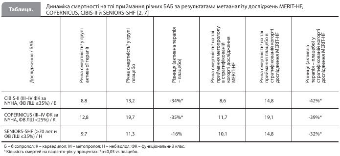 Метопролол при застійній СН Фармакологічний ефект БАБ при застійній СН (СН зі зниженою фракцією викиду, СНзнФВ) базується на блокаді активності симпатичної нервової системи, запобіганні підвищенню рівня катехоламінів, зниженні частоти серцевих скорочень (ЧСС) та протидії проапоптотичним і кардіотоксичним ефектам перевантаження кальцієм, опосередкованого циклічним аденозинмонофосфатом [3]. В останній європейській настанові з ведення хворих на СН експерти рекомендують використовувати БАБ при СНзнФВ будь-якого ступеня тяжкості для зниження ризику смерті та госпіталізації з приводу СН (рекомендація класу I) [4]. БАБ слід призначати клінічно стабільним еуволемічним пацієнтам у низькій дозі і поступово підвищувати її до максимальної переносимої [4]. Для метопрололу CR/XL це означає поступове збільшення дози з 12,5–25 мг 1 раз на добу до цільової дози 200 мг 1 раз на добу (або максимальної переносимої дози) [4]. Основним клінічним дослідженням метопрололу CR/XL, яке продемонструвало потенціал препарату в зниженні смертності серед пацієнтів із декомпенсованою СН, є подвійне сліпе рандомізоване плацебо-контрольоване дослідження MERIT-HF (Metoprolol CR/XL Randomized Intervention Trial in Congestive Heart Failure) [5]. 3991 пацієнт із хронічною СНзнФВ різного ступеня тяжкості (II–IV функціональний клас за класифікацією New York Heart Association [NYHA] і фракція викиду лівого шлуночка [ФВ ЛШ] ≤40%) взяв участь у цьому дослідженні. Усі учасники MERIT-HF уже отримували терапію інгібіторами ангіотензинперетворювального ферменту (іАПФ) і діуретиками. Цільова доза метопрололу CR/XL становила 200 мг 1 р/добу, дозу поступово збільшували протягом 8 тижнів. Дослідження було припинено достроково, оскільки в середньому через рік спостереження група метопрололу CR/XL продемонструвала значне зниження ризику смерті порівняно з групою плацебо. Зокрема, терапія метопрололом CR/XL привела до 34% зниження загальної смертності (7,2 vs 11,0%, відношення ризиків [ВР] 0,66, 95% довірчий інтервал [ДІ] 0,53–0,81; p=0,00009), 41% зниження ризику раптової смерті (ВР 0,59, 95% ДІ 0,45–0,78; p=0,0002) і 49% зниження ризику смерті внаслідок погіршення перебігу СН (ВР 0,51, 95% ДІ 0,33–0,79; p=0,0023) порівняно з плацебо. Додатково в групі метопрололу CR/XL відзначалося зниження частоти госпіталізацій із приводу СН на 30%, зниження функціонального класу СН за NYHA і покращення самопочуття пацієнтів порівняно з групою плацебо [5, 6]. Опосередковано порівняти ефекти метопрололу CR/XL на захворюваність і смертність при СН з ефектами інших часто призначуваних БАБ дозволив об'єднаний аналіз великомасштабних досліджень метопрололу сукцинату, бісопрололу, карведилолу і небівололу (дослідження MERITHF, COPERNICUS, CIBIS-II і SENIORS-SHF) [7]. Для цілей аналізу учасників дослідження MERIT-HF стратифікували, щоб отримати когорти, зіставні за вихідними характеристиками з досліджуваними вибірками COPERNICUS, CIBISII і SENIORS-SHF (табл.) [2]. Досліджуваними кінцевими точками аналізу були загальна смертність, комбінація «загальна смертність / госпіталізація з СС причин», комбінація «загальна смертність / госпіталізація з приводу СН» і показники переносимості терапії. Аналіз загальної смертності показав, що із чотирьох досліджуваних БАБ небіволол був найменш ефективним і мав найгірший профіль переносимості, а метопролол CR/XL був пов'язаний із чисельно більшим зниженням смертності порівняно з іншими БАБ (табл.) [2, 7]. Аналогічні результат