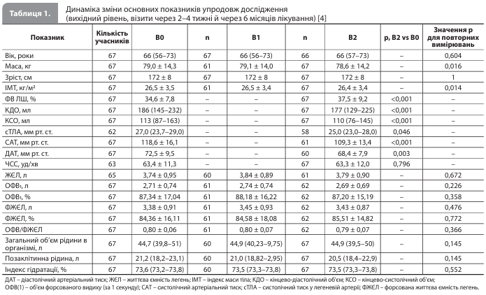 Методологія дослідження Mapelli et al. Дослідження проводилося у відділенні СН міланської кардіологічної клініки й включало дорослих (вік >18 років) стабільних амбулаторних пацієнтів із СНзнФВ (ФВ ЛШ ≤40%) і показаннями до призначення іНЗКТГ2. Ознакою стабільності стану учасника була відсутність епізодів декомпенсації СН (тобто госпіталізацій із приводу СН із внутрішньовенним введенням діуретиків) протягом останніх 3 місяців. До участі в дослідженні не допускалися пацієнти з протипоказаннями до призначення іНЗКТГ2, середньотяжким або тяжким хронічним обструктивним захворюванням легень (ХОЗЛ) або розрахунковою швидкістю клубочкової фільтрації (рШКФ) <30 мл/хв/1,73 м2 [4]. Усі учасники на початку дослідження проходили кардіопульмональний навантажувальний тест (КПНТ). Візити дослідження проводилися тричі – на початковому рівні (В0), через 2–4 тижні після початку досліджуваного лікування (В1) і через 6 місяців лікування дапагліфлозином (В2). Під час візитів В0 і В2 учасники проходили комплексне обстеження, що включало медичний огляд, аналізи крові (загальний аналіз крові, оцінка рівнів креатиніну, азоту сечовини, натрію, калію, гемоглобіну (Hb), N-термінального фрагмента мозкового натрійуретичного пептиду (NT-proBNP), інтерлейкіну ST-2 (suppression of tumorigenesis 2), високочутливого С-реактивного білка (вчСРБ) і високочутливого тропоніну I (вчTnI)), стандартну спірометрію, КПНТ на велоергометрі відповідно до максимального рамп-протоколу (безперервний ріст навантаження), трансторакальну ехокардіографію (ЕхоКГ), векторний аналіз біоелектричного імпедансу (BIVA), а також заповнювали Канзаський опитувальник для оцінки якості життя (ЯЖ) хворих на кардіоміопатію (KCCQ-12; загальний бал розраховувався як середнє значення чотирьох оцінок, що відображали фізичні обмеження, частоту симптомів, ЯЖ і соціальні обмеження). На візиті В1 проводилася оцінка безпеки лікування за результатами фізикального обстеження та аналізів крові, а також BIVA. На візиті В0 після обстеження пацієнтам призначали дапагліфлозин у дозі 10 мг/добу, лікування тривало безперервно протягом 6 місяців [4]. КПНТ супроводжувався спірометрією з визначенням таких показників: об'єм хвилинної вентиляції (VE), об'єм споживання кисню (VO2), максимальний об'єм споживання кисню (VO2max), об'єм видихуваного СО2 (VCO2), ефективність вентиляції (кутовий коефіцієнт VE/VCO2: вентиляторний еквівалент за СO2, що відображає об'єм хвилинної вентиляції, необхідний для виділення 1 л СO2; розрахунковий і у відсотках від прогнозованого значення), анаеробний поріг (АП) (за результатами аналізу графіків зміни VO2 і VCO2) і співвідношення VO2/потужність навантаження. Крім того, проводився безперервний моніторинг частоти серцевих скорочень (ЧСС), параметрів ЕКГ, результатів оксиметрії, а також моніторинг артеріального тиску (АТ; у стані спокою і через кожні 2 хвилини в ході КПНТ). Додатково розраховувався індекс MECKI (комбінований індекс, що об'єднує шість важливих прогностичних параметрів: рівень Hb, ФВ ЛШ, рШКФ за формулою MDRD, рівень Na в крові, VO2max і VE/VCO2). Результати KCCQ-12, КПНТ, спірометрії, BIVA й ЕхоКГ аналізували дослідники, які не знали, на якому конкретно візиті (В0, В1 або В2) були отримані ці дані [4]. Результати статистичної обробки представлені у вигляді середнього значення ± стандартне відхилення (СВ) для безперервних змінних із нормальним розподілом, медіан