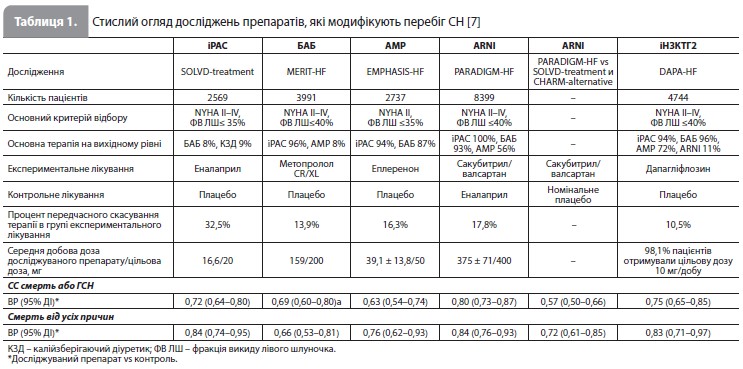 Основні характеристики аналізу Shen et al. У вказаному аналізі автори використали п’ять досліджень, проведених за участю пацієнтів зі СНзнФВ, щоб оцінити ефект лікування п’ятьма хворобомодифікуючими препаратами. Дані про ефекти цих класів препаратів були отримані з наступних досліджень: інгібування РАС – з дослідження Studies of Left Ventricular Dysfunction (SOLVD)Treatment [8], БАБ – з дослідження Metoprolol CR/XL Randomized Intervention Trial in Congestive Heart Failure (MERIT-HF) [9], АМР – з дослідження Eplerenone in Mild Patients Hospitalization and Survival Study in Heart Failure (EMPHASIS-HF) [10], інгібітор неприлізину/блокатор рецепторів ангіотензину (ARNI) – з дослідження ACEI to Determine Impact on Global Mortality and Morbidity in Heart Failure (PARADIGM-HF), іНЗКТГ2 – з дослідження Dapagliflozin and Prevention of Adverse Outcomes in Heart Failure (DAPAHF) [4]. Для створення вибірки пацієнтів зі СНзнФВ, які раніше не отримували жоден з п'яти фармакологічних класів препаратів, що знижують смертність, використовували комбіновану когорту учасників, рандомізованих у групу плацебо, з досліджень SOLVD-Treatment (еналаприл vs плацебо) і Candesartan in Heart Failure: Assessment of Reduction in Mortality and Morbidity (CHARM)-Alternative (кандесартан vs плацебо) [11], які не отримували БАБ або АМР (табл. 1). Вказаний набір даних використовували для визначення показників частоти наслідків, які становили інтерес.