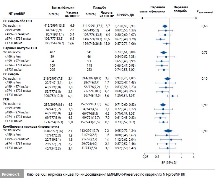 Основні відомості про методологію дослідження EMPEROR-Preserved і аналізу Januzzi et al. Дослідження EMPEROR-Preserved було рандомізованим подвійним сліпим плацебо-контрольованим дослідженням за участю пацієнтів із СН II–IV функціонального класу за класифікацією Нью-Йоркської кардіологічної асоціації (NYHA), ФВ ЛШ >40% і концентрацією NT-proBNP >300 нг/л (за наявності фібриляції передсердь [ФП] граничне значення концентрації підвищувалося до >900 нг/л). Учасники дослідження випадково розподілялися для отримання плацебо або емпагліфлозину 10 мг один раз на добу. Для свого аналізу Januzzi et al. використовували такі кінцеві точки дослідження EMPERORPreserved: первинну комбіновану кінцеву точку (комбінація СС смерті й госпіталізації з приводу СН), першу вторинну кінцеву точку (частота всіх [перших і повторних] госпіталізацій з приводу СН), другу вторинну кінцеву точку (швидкість зміни розрахункової швидкості клубочкової фільтрації [рШКФ] під час періоду подвійного сліпого лікування) і комбіновану ниркову кінцеву точку (час до виникнення першої з наступних подій: хронічний діаліз, трансплантація нирки, стійке зниження рШКФ до <15 мл/хв/1,73 м2 у пацієнтів з вихідною рШКФ ≥30 мл/хв/1,73 м2, або стійке зниження рШКФ до <10 мл/хв/1,73 м2 у пацієнтів з вихідною рШКФ <30 мл/хв/1,73 м2, або стійке зниження рШКФ на 40% і більше) [8]. З метою аналізу Januzzi et al. розподілили учасників дослідження EMPEROR-Preserved за квартилями (К) залежно від вихідних рівнів NT-proBNP і вч-сТнT (табл. 1). Крім аналізів, спрямованих на оцінку взаємодії між квартилем вихідної концентрації серцевого біомаркера й ефектом лікування на перераховані кінцеві точки, вивчався вплив досліджуваної терапії на середні геометричні значення концентрацій NT-proBNP на кожному візиті дослідження, а також зв'язок між зміною концентрації NT-proBNP від вихідного рівня до 12-го тижня й наступними подіями первинної кінцевої точки, зафіксованими після 12-го тижня. На статистичну значимість результатів статистичних аналізів указувало значення р<0,05 [8].