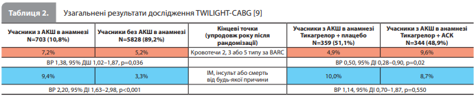 Обговорення і висновки Отже, можна окреслити такі основні результати апостеріорного аналізу дослідження TWILIGHT, проведеного Sardella et al. для порівняння ефектів монотерапії тикагрелором і продовження ПАТ у пацієнтів з АКШ в анамнезі та без анамнезу АКШ (табл. 2) [9]: 1. Раніше перенесене АКШ пов'язане з підвищеним ризиком великих кровотеч та ішемічних подій порівняно з пацієнтами без анамнезу АКШ. 2. Монотерапія тикагрелором зменшувала частоту розвитку кровотеч порівняно з продовженням ПАТ, не збільшуючи при цьому частоти ішемічних подій, незалежно від статусу АКШ. 3. Переваги скасування АСК після 3-місячної ПАТ порівняно з продовженням ПАТ зберігалися для всіх ішемічних і геморагічних кінцевих точок незалежно від судини, на якій виконували ЧКВ (нативна судина vs коронарний шунт). З огляду на характер дослідження TWILIGHT-CABG (апостеріорний аналіз даних дослідження TWILIGHT) отримані результати розповсюджуються лише на пацієнтів, які відповідають характеристикам учасників дослідження TWILIGHT, відносяться лише до антиагрегантної терапії на основі тикагрелору та, загалом, мають розглядатись як дані, що генерують гіпотези, й перевірятися в подальших добре організованих дослідженнях.