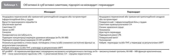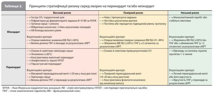 Клінічна картина й діагностичне обстеження Оскільки основною проблемою діагностики ЗМПС є правильне розпізнавання ознак і симптомів, робоча група описала специфічні тривожні ознаки, виявлення яких дає змогу запідозрити міо- та/або перикардит (табл. 1). За наявності підозри на ЗМПС план обстеження необхідно адаптувати з урахуванням індивідуального ризику, тяжкості клінічної картини і відповіді на медикаментозну терапію. У настанові представлено кілька рекомендацій I класу щодо обстеження таких пацієнтів. Зокрема, усім пацієнтам із підозрою на міокардит або перикардит під час первинної оцінки рекомендується повне клінічне обстеження, яке включає збір анамнезу, фізикальне обстеження, визначення маркерів запалення, рентгенографію органів грудної клітки, електрокардіографію (ЕКГ) і ехокардіографію (ЕхоКГ). За наявності клінічної підозри на міокардит або перикардит для неінвазивної діагностики запального процесу рекомендується використовувати сМРТ. Крім того, пацієнтів із перикардитом високого ризику й хворих із міокардитом помірного й високого ризику (табл. 2) рекомендується госпіталізувати для спостереження та лікування.