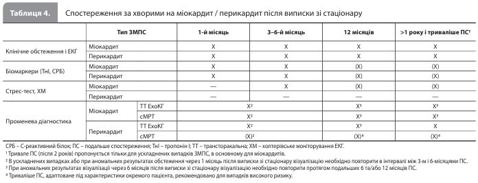 Стратифікація ризику, ускладнення та наслідки ЗМПС Після перенесеного міокардиту рекомендується організувати спостереження за пацієнтом, що включає клінічну оцінку, визначення рівнів запальних маркерів, навантажувальний тест, ЕКГ (включно з холтерівським моніторуванням), ЕхоКГ і сМРТ, протягом щонайменше 6 місяців після госпіталізації. На думку авторів настанови, таке спостереження полегшить виявлення випадків прогресування та/або нових факторів ризику. Пацієнтам з ускладненим міокардитом, а також пацієнтам із персистуючим або рецидивним перикардитом рекомендується довготривале спостереження для виявлення потенційного прогресування та нових ускладнень (усі рекомендації І класу) (табл. 4).