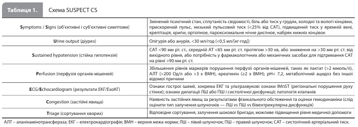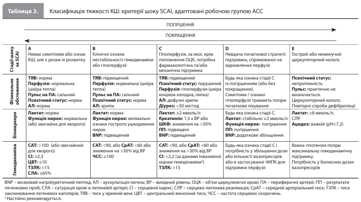 Визначення, критерії Критеріям ГІМ-КШ відповідає КШ, викликаний ГІМ із підйомом і без підйому сегмента ST (ІМпST і ІМбпST відповідно), при цьому в основі ліво-, правошлуночкової або бівентрикулярної дисфункції можуть лежати тривала ішемія або ішемічне ушкодження міокарда, а також механічні ускладнення ГІМ. Слід зазначити, що КШ, викликаний гострою брадиаритмією, тахіаритмією або прогресуючою серцевою блокадою, станом після зупинки серця або будь-якими іншими ускладненнями ГІМ, також класифікується як ГІМ-КШ. СН-КШ є наслідком первинної дисфункції міокарда, спричиненої ішемічною або неішемічною кардіоміопатією. СН-КШ можна поділити на КШ внаслідок de novo СН (тобто гостра дисфункція міокарда, що виникла вперше) і КШ внаслідок гострої декомпенсації СН (тобто гостра декомпенсація хронічної або прогресуючої СН). Як і у випадку з ГІМ-КШ, СН-КШ може бути пов'язаний із лівосторонньою, правосторонньою або двосторонньою (бівентрикулярною) дисфункцією шлуночків. Основними причинами розвитку дисфункції міокарда, що призводить до СН-КШ, є гострий міокардит, кардіоміопатія (КМП) Такоцубо, перипартальна КМП, тахікардична КМП, гіпертрофічна КМП та інфільтративні захворювання серця, зокрема амілоїдоз і саркоїдоз. У таблиці 1 представлений запропонований робочою групою АСС алгоритм дій щодо підтвердження діагнозу КШ (схема SUSPECT CS). У документі підкреслюється, що на етапі первинної підозри й діагностики КШ не потрібно проводити інвазивну оцінку гемодинаміки; проте така оцінка часто допомагає з'ясувати ступінь залучення шлуночків і профіль застійних явищ у пацієнта з КШ і може допомогти в ухваленні терапевтичного рішення. Після постановки діагнозу КШ для оцінки ступеня тяжкості / стадії КШ рекомендується використовувати адаптовану класифікацію SCAI (табл. 2).