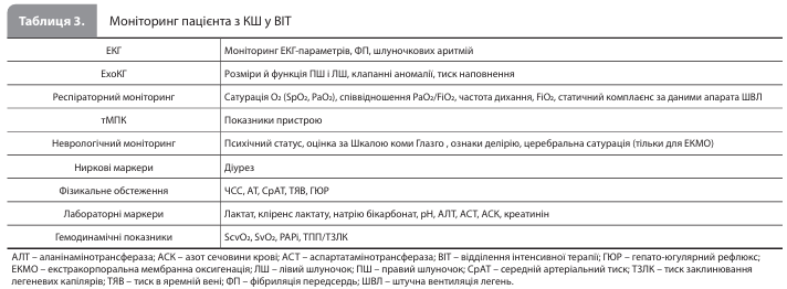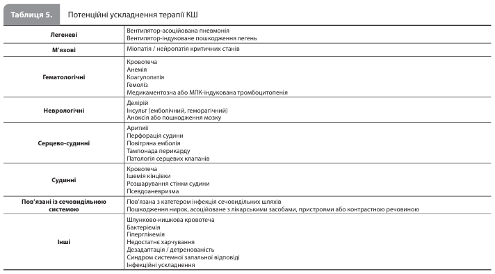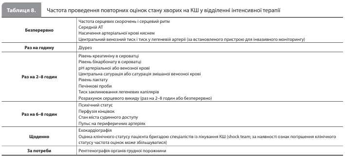 Організація інтенсивної терапії Ключові елементи безперервної інтенсивної терапії КШ включають: 1) послідовну переоцінку показників адекватності гемодинамічної підтримки (табл. 8); 2) лікування оборотних причин КШ; 3) корекцію ускладнень тМПК та інших втручань, які проводяться у відділенні інтенсивної терапії; 4) лікування ушкоджень органів-мішеней, викликаних КШ; 5) якнайшвидшу деескалацію інвазивної терапії; та 6) скоординоване міждисциплінарне ухвалення рішень щодо схеми ведення пацієнта та цілей лікування КШ (відновлення міокарда, передові методи лікування або паліативна допомога). Серед ускладнень інтенсивної терапії КШ (табл. 5) найбільшої уваги вимагають ускладнення в місці судинного доступу, що використовується для підключення пристрою для тМПК, зокрема кровотеча та ішемія кінцівок, розвиток яких значно підвищує ризик смерті. Якщо ухвалено рішення видалити пристрій для тМПК, то при діаметрі катетера ≥12 FR робити це краще в операційній або катетеризаційній лабораторії. Не менш важливим є вибір режиму штучної вентиляції легенів (ШВЛ), оскільки, наприклад, режим позитивного тиску в кінці видиху може по-різному впливати на гемодинамічний статус при різних варіантах КШ.