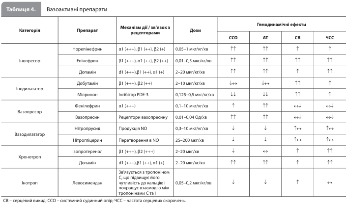 Фармакотерапія КШ Метою фармакотерапії КШ є усунення застійних явищ (за наявності), нормалізація серцевого викиду й поліпшення перфузії життєво важливих органів. За наявності застійного фенотипу використовуються внутрішньовенні (в/в) петльові діуретики, тіазидні діуретики і, за відсутності ефекту від фармакотерапії, замісна ниркова терапія. Персистуючий застій може призвести до мікроциркуляторної ішемії та пошкодження нирок, печінки, шлунково-кишкового тракту й інших органів. Для корекції гіпоперфузії використовуються в/в вазоактивні препарати, зокрема інотропи, хронотропи, інопресори, інодилататори, вазодилататори й вазопресори (табл. 4). Слід пам'ятати, що деякі із цих препаратів пов'язані з підвищеним ризиком розвитку побічних ефектів, у тому числі аритмій і підвищеного споживання кисню міокардом, тому робоча група АСС рекомендує використовувати вазоактивні препарати при КШ у мінімальній дозі, необхідній для підтримки адекватної перфузії, і протягом якомога коротшого періоду часу. Кокранівський метааналіз 2020 р. не виявив достатніх доказів переваги конкретного інотропного або вазодилатуючого засобу при КШ, у тому числі з точки зору зниження смертності. У дослідженні DOREMI (Dobutamine Compared with Milrinone), присвяченому порівнянню добутаміну й мілринону в 192 пацієнтів із КШ (стадії В–Е за класифікацією SCAI), досліджувані препарати не відрізнялися за впливом на первинну кінцеву точку – комбінацію внутрішньолікарняної смерті від будь-якої причини, успішної реанімації після зупинки серця, трансплантації серця, початку механічної підтримки кровообігу, нефатального інфаркту міокарда, транзиторної ішемічної атаки / інсульту й початку замісної ниркової терапії. Проте лікар може оптимізувати терапію конкретного пацієнта з урахуванням особливостей перебігу КШ. Зокрема, використання інодилататорів або вазодилататорів можна розглядати при нормотензивному КШ, особливо у пацієнтів із підвищеним системним судинним опором. В/в мілрінон, з огляду на його відносно тривалий період напіввиведення і ниркову екскрецію, слід розумно використовувати в пацієнтів із погіршенням функції нирок. Хронотропи можуть бути корисні при КШ, викликаному брадикардією. Водночас, оскільки чисті вазопресори (наприклад, фенілефрин) можуть викликати рефлекторну брадикардію і знижувати серцевий викид при КШ, робоча група настійно не рекомендує використовувати їх у якості єдиного препарату першої лінії для безперервного в/в введення. За відсутності чіткого консенсусу щодо вибору вазоактивного препарату першої лінії, фахівці АСС згодні з тим, що введення норадреналіну є обґрунтованим першим вибором для більшості пацієнтів із КШ і гіпотензією. При рефрактерності пацієнта до початкової фармакологічної терапії слід розглядати доцільність його переведення до медичного центру вищого рівня з можливістю проведення тМПК та/або передових методів лікування.