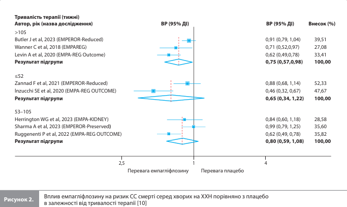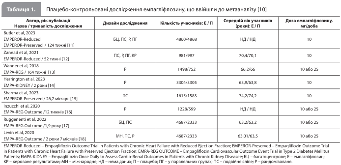 Вплив емпагліфлозину на серцево-судинні наслідки в пацієнтів із хронічною хворобою нирок: результати систематичного огляду й метааналізуХронічна хвороба нирок (ХХН) широко поширена в загальній популяції (поширеність понад 10%) і часто поєднується із серцево-судинними (СС) та обмінними захворюваннями, зокрема із серцевою недостатністю (СН) i цукровим діабетом 2 типу (ЦД2) [1]. У коморбідних пацієнтів ХХН додатково збільшує СС захворюваність і смертність [2], а також ризик небажаних ниркових наслідків, включно з термінальною стадією ниркової недостатності, що вимагає діалізу або трансплантації нирки [3]. Крім негативного впливу на прогноз пацієнтів, ХХН створює істотне навантаження на систему охорони здоров’я внаслідок інтенсивного витрачання фінансових і матеріальних ресурсів [4, 5], що пояснює високу потребу в терапевтичних підходах, які поліпшують клінічні результати в пацієнтів із ХХН [6]. Для хворих, у яких ХХН поєднується із СН та/або ЦД2, таким підходом може бути застосування інгібіторів натрійзалежного котранспортера глюкози 2 типу (іНЗКТГ2), наприклад емпагліфлозину, який, за даними досліджень, знижує смертність, зменшує ризик СС і ниркових ускладнень та сповільнює прогресування ниркової дисфункції в таких пацієнтів [7–9]. Проте наявна інформація про вплив дисфункції нирок на СС ефекти емпагліфлозину є досить суперечливою, що спонукало Foroutan et al. провести систематичний огляд і метааналіз основних клінічних досліджень емпагліфлозину з акцентом на СС ефекти лікування у хворих на ХХН [10].