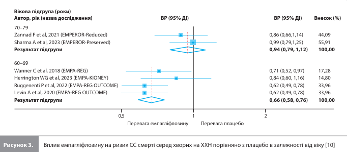 Проведений аналіз ефектів емпагліфлозину на ризик СС смерті за ХХН у підгрупах, виділених з урахуванням тривалості терапії емпагліфлозином (≤52 тижнів, 53–105 тижнів, >105 тижнів), показав такі результати. У підгрупах, які отримували емпагліфлозин протягом ≤105 тижнів (≤2 років), ризик СС смерті істотно не відрізнявся від такого в групі плацебо (терапія тривалістю ≤52 тижнів: ВР 0,65, 95% ДІ 0,34–1,22; терапія тривалістю 53–105 тижнів: ВР 0,80, 95% ДІ 0,59–1,08). Водночас терапія емпагліфлозином тривалістю понад 105 тижнів асоціювалася зі значним зниженням ризику СС смерті порівняно з плацебо (ВР 0,75; 95% ДІ 0,57–0,98) (рис. 2). Отже, було показано, що для значного зниження ризику СС смерті за ХХН необхідне тривале (принаймні 2 роки) застосування емпагліфлозину [10]. Другий аналіз у підгрупах, проведений з урахуванням віку пацієнтів, показав статистично значуще зниження ризику СС смерті на 34% у хворих на ХХН віком 60–69 років (ВР 0,66; 95% ДІ 0,58–0,76) і відсутність статистично значущого ефекту емпагліфлозину на цей параметр у віковій підгрупі 70–79 років (ВР 0,94; 95% ДІ 0,79–1,12) (рис. 3). На основі цих результатів автори зробили висновок про зменшення ефективності емпагліфлозину в зниженні ризику СС смерті зі збільшенням віку пацієнта [10].