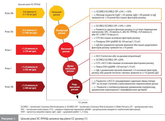 Основна інформація: 1. Для оцінки 10-річного СС ризику в осіб віком 40–69 і 70–89 років без діагностованих ССЗ пропонується використовувати шкали SCORE2 та SCORE2-OP відповідно, а також ураховувати низку додаткових модифікаторів ризику. 2. Рекомендується вимірювати рівень Лп(а) у кожного дорослого як мінімум один раз у житті. При високому рівні Лп(а) і високому СС ризику рекомендована високоінтенсивна статинотерапія. 3. Всім пацієнтам із ГКС показано негайний початок комбінованої терапії статином і одним або декількома нестатиновими препаратами, які доведено знижують ризик СС ускладнень. 4. Якщо максимальна переносима доза статинів не знижує рівень ХС ЛПНЩ до цільових значень, рекомендується доповнити схему терапії нестатиновими препаратами з доведеною користю для СС системи. 5. Препаратами першого вибору при ГТГ із високим СС ризиком є статини. Якщо, попри терапію статинами, СС ризик залишається високим, для його зниження можна призначати високі дози (4 г на день) ікозапент етилу. 6. Статини показані всім ВІЛ-інфікованим віком ≥40 років, незалежно від СС ризику й рівня ХС ЛПНЩ. 7. За відсутності підтверджених даних про безпечність і значну ефективність у вигляді зниження рівня ХС ЛПНЩ використовувати харчові добавки або вітаміни для зниження СС ризику не рекомендується.