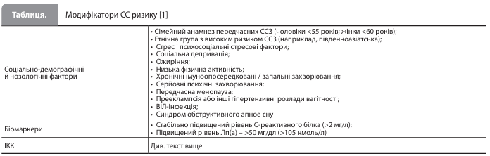 Оцінка СС ризику й використання її результату при дисліпідемії Для оцінки 10-річного СС ризику (ризику розвитку інфаркту міокарда [ІМ], ішемічного інсульту або смерті внаслідок атеросклеротичної СС події) в осіб без діагностованих СС захворювань (ССЗ) замість шкали SCORE, що застосовувалася раніше, пропонується використовувати шкали SCORE2 і SCORE2-OP для осіб віком 40–69 і 70–89 років відповідно. Додатково пропонується використовувати низку модифікаторів, що дозволяють змінити (підвищити) категорію ризику, отриману за результатами застосування шкал SCORE2/SCORE2-OP (табл.). У пацієнтів із цукровим діабетом 2 типу (ЦД2) без атеросклеротичних ССЗ (АССЗ) оцінювати 10-річний СС ризик рекомендується за допомогою запропонованої в 2023 р. шкали SCORE2-Diabetes. Додатковим модифікатором СС ризику може бути індекс коронарного кальцію (ІКК), оскільки результати недавніх досліджень продемонстрували значущість субклінічного атеросклерозу коронарних або периферичних артерій в осіб без клінічних АССЗ. І хоча досі не доведено, що використання ІКК для класифікації СС ризику й вибору стратегії лікування покращує СС результати, передбачається, що застосування ІКК підвищить точність оцінки ризику, отриманої за допомогою шкали SCORE2. Згідно з новою рекомендацією, наявність субклінічного атеросклерозу (за даними візуалізації) або підвищений ІКК (якщо виміряний) слід розглядати як модифікатори ризику в осіб із помірним СС ризиком або з показниками, близькими до порогових для призначення ГЛТ.