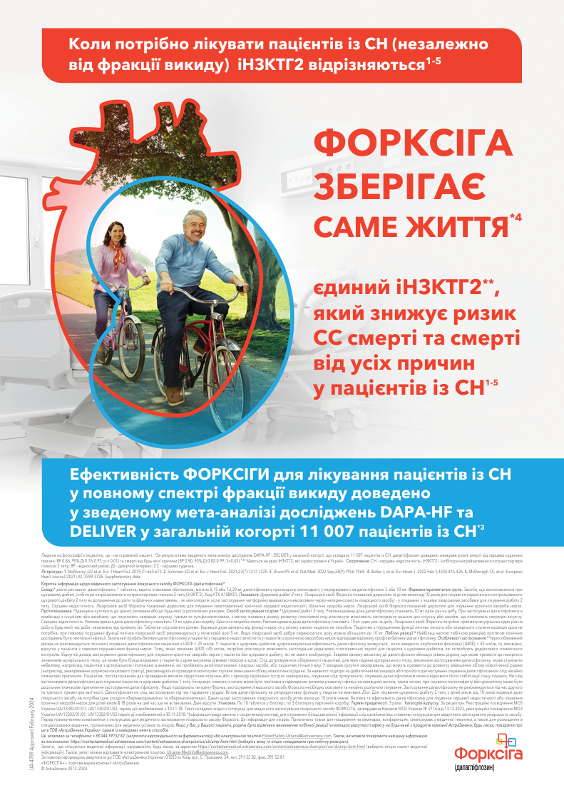 Вплив дапагліфлозину на вторинні кінцеві точки ефективності при серцевій недостатності: результати італійського одноцентрового дослідженняРезюме. У статті представлено результати комплексної оцінки впливу 6-місячної терапії дапагліфлозином на низку вторинних показників ефективності, що відображають фізичну працездатність, зворотне ремоделювання лівого шлуночка, затримку рідини, функцію нирок і легенів у групі із 75 амбулаторних пацієнтів із СН зі зниженою фракцією викиду (<40%). Результатом лікування стало значне покращення середньої фракції викиду, кінцево-діастолічного й кінцево-систолічного об’ємів лівого шлуночка, показника ефективності вентиляції легенів при фізичному навантаженні, середнього рівня гемоглобіну, функціонального класу за класифікацією NYHA та індексу MECKI. Ефект дапагліфлозину на пікове споживання кисню, функцію нирок, концентрацію NT-proBNP, інтерлейкіну ST-2 і вчТнI, рівень рідини в організмі та якість життя за KCCQ виявився нейтральним. Випадки скасування терапії через розвиток небажаних ефектів не зареєстровані. На основі отриманих даних автори пов’язали терапію дапагліфлозином із позитивним ремоделюванням лівого шлуночка, підвищенням ефективності вентиляції легенів при фізичному навантаженні й покращенням класу СН за NYHA, а також (на основі змін індексу MECKI) із позитивним впливом на 2-річний прогноз пацієнтів. Дапагліфлозин – препарат із класу інгібіторів натрійзалежного котранспортера глюкози 2 типу (іНЗКТГ2) із доведеною в рандомізованих дослідженнях значною клінічною та прогностичною ефективністю при серцевій недостатності (СН) зі зниженою (СНзнФВ), помірно зниженою та збереженою фракцією викиду (ФВ) лівого шлуночка (ЛШ) [1–3]. Ці результати рандомізованих клінічних досліджень обґрунтували включення іНЗКТГ2, у тому числі дапагліфлозину, до стандартних схем медикаментозної терапії СН і появу відповідних рекомендацій у сучасних настановах щодо ведення хворих на СН. Наразі відбувається активне накопичення відомостей про результати застосування дапагліфлозину в умовах реальної клінічної практики, які вкрай важливі для оптимізації алгоритмів лікування і розуміння механізмів клінічної ефективності препарату при СН. Одне з таких досліджень, присвячене оцінці ефектів дапагліфлозину на низку біологічних функцій, зокрема на толерантність до фізичного навантаження, систолічну функцію серця, функцію нирок і легенів, гомеостаз рідини організму, а також на якість життя в пацієнтів із СНзнФВ, провели й опублікували Mapelli et al. [4].