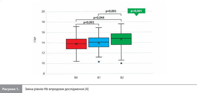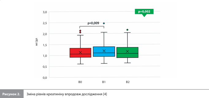 Результати дослідження Mapelli et al. Дослідження тривало із січня 2022 року по липень 2023 року й охопило 75 пацієнтів. Вісім пацієнтів (10,7%) достроково припинили приймання дапагліфлозину або участь у дослідженні з особистих причин, не пов'язаних із досліджуваним лікуванням, і тому були виключені з остаточного аналізу. Із решти 67 учасників (табл. 1) 62 пройшли всі три візити дослідження і ще 5 осіб пройшли В0 і В2, але не пройшли оцінку безпеки на візиті В1 [4]. На момент включення в дослідження всі учасники отримували оптимальну медикаментозну терапію СН: усі пацієнти приймали або інгібітор ангіотензинперетворювального ферменту (n=6 [9%]), або блокатор рецепторів ангіотензину (n=7 [10,4%]), або комбінацію сакубітрил + валсартан (n=54 [80,6%]); 64 (95,5%) пацієнти отримували β-блокатор, 56 (83,6%) – антагоністи мінералокортикоїдних рецепторів, 35 (52,2%) – петльовий діуретик. Структура супутніх захворювань на вихідному рівні була такою: у 7 (10,4%) пацієнтів був цукровий діабет, у 40 (59,7%) – дисліпідемія, у 33 (49,3%) – артеріальна гіпертензія і у 1 (1,5%) – легка форма ХОЗЛ; 12 (18%) пацієнтів були активними курцями, 26 (39%) – колишніми курцями. Схема терапії, зокрема медіанна доза петльових діуретиків, залишалася стабільною протягом усього дослідження. Жодному учаснику, який не приймав петльові діуретики на початковому рівні, ці препарати протягом дослідження не призначалися [4]. Після 6 місяців лікування дапагліфлозином спостерігалося зниження рівнів систолічного й діастолічного АТ порівняно з В0, збільшення ФВ ЛШ на 8 процентних пунктів із паралельним зменшенням об'ємів ЛШ і невеликим, але значним, зниженням систолічного тиску в легеневій артерії (табл. 1). Крім того, було виявлено прогресуюче підвищення рівня Hb (13,8 ± 1,5, 13,9 ± 1,5 і 14,6 ± 1,7 г/дл для В0, В1 і В2 відповідно; p<0,001) (рис. 1) і ширини розподілу еритроцитів (13,7 [13,1–14,6], 13,8 [13,3–14,6], 13,8 [13,3–14,6] відповідно; p<0,019). Водночас значних змін з боку ЧСС, концентрацій Na+ (p=0,192), NT-proBNP (р=0,081), інтерлейкіну ST-2 (p=0,829), вчСРБ (p=0,114) і вчТнI (p=0,201) за період спостереження не виявлено [4]. Оцінка безпеки, проведена під час В1, показала короткочасне підвищення рівня креатиніну (p=0,009 для В1 порівняно з В0) із повним відновленням значень до вихідного рівня на В2 (рис. 2). Таку ж тимчасову тенденцію показали результати розрахунків рШКФ за формулою MDRD (73,0 ± 22,8, 68,8 ± 21,3 і 70,2 ± 20,9 на В0, В1 і В2 відповідно; p<0,01).