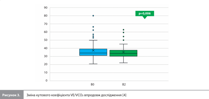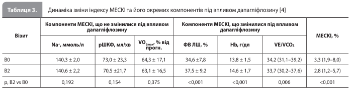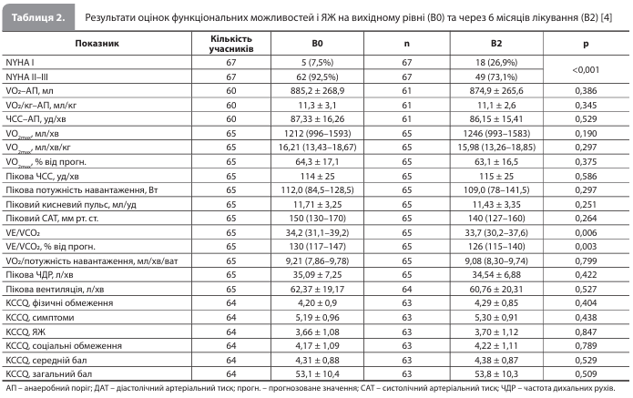Методологія дослідження Mapelli et al. Дослідження проводилося у відділенні СН міланської кардіологічної клініки й включало дорослих (вік >18 років) стабільних амбулаторних пацієнтів із СНзнФВ (ФВ ЛШ ≤40%) і показаннями до призначення іНЗКТГ2. Ознакою стабільності стану учасника була відсутність епізодів декомпенсації СН (тобто госпіталізацій із приводу СН із внутрішньовенним введенням діуретиків) протягом останніх 3 місяців. До участі в дослідженні не допускалися пацієнти з протипоказаннями до призначення іНЗКТГ2, середньотяжким або тяжким хронічним обструктивним захворюванням легень (ХОЗЛ) або розрахунковою швидкістю клубочкової фільтрації (рШКФ) <30 мл/хв/1,73 м2 [4]. Усі учасники на початку дослідження проходили кардіопульмональний навантажувальний тест (КПНТ). Візити дослідження проводилися тричі – на початковому рівні (В0), через 2–4 тижні після початку досліджуваного лікування (В1) і через 6 місяців лікування дапагліфлозином (В2). Під час візитів В0 і В2 учасники проходили комплексне обстеження, що включало медичний огляд, аналізи крові (загальний аналіз крові, оцінка рівнів креатиніну, азоту сечовини, натрію, калію, гемоглобіну (Hb), N-термінального фрагмента мозкового натрійуретичного пептиду (NT-proBNP), інтерлейкіну ST-2 (suppression of tumorigenesis 2), високочутливого С-реактивного білка (вчСРБ) і високочутливого тропоніну I (вчTnI)), стандартну спірометрію, КПНТ на велоергометрі відповідно до максимального рамп-протоколу (безперервний ріст навантаження), трансторакальну ехокардіографію (ЕхоКГ), векторний аналіз біоелектричного імпедансу (BIVA), а також заповнювали Канзаський опитувальник для оцінки якості життя (ЯЖ) хворих на кардіоміопатію (KCCQ-12; загальний бал розраховувався як середнє значення чотирьох оцінок, що відображали фізичні обмеження, частоту симптомів, ЯЖ і соціальні обмеження). На візиті В1 проводилася оцінка безпеки лікування за результатами фізикального обстеження та аналізів крові, а також BIVA. На візиті В0 після обстеження пацієнтам призначали дапагліфлозин у дозі 10 мг/добу, лікування тривало безперервно протягом 6 місяців [4]. КПНТ супроводжувався спірометрією з визначенням таких показників: об'єм хвилинної вентиляції (VE), об'єм споживання кисню (VO2), максимальний об'єм споживання кисню (VO2max), об'єм видихуваного СО2 (VCO2), ефективність вентиляції (кутовий коефіцієнт VE/VCO2: вентиляторний еквівалент за СO2, що відображає об'єм хвилинної вентиляції, необхідний для виділення 1 л СO2; розрахунковий і у відсотках від прогнозованого значення), анаеробний поріг (АП) (за результатами аналізу графіків зміни VO2 і VCO2) і співвідношення VO2/потужність навантаження. Крім того, проводився безперервний моніторинг частоти серцевих скорочень (ЧСС), параметрів ЕКГ, результатів оксиметрії, а також моніторинг артеріального тиску (АТ; у стані спокою і через кожні 2 хвилини в ході КПНТ). Додатково розраховувався індекс MECKI (комбінований індекс, що об'єднує шість важливих прогностичних параметрів: рівень Hb, ФВ ЛШ, рШКФ за формулою MDRD, рівень Na в крові, VO2max і VE/VCO2). Результати KCCQ-12, КПНТ, спірометрії, BIVA й ЕхоКГ аналізували дослідники, які не знали, на якому конкретно візиті (В0, В1 або В2) були отримані ці дані [4]. Результати статистичної обробки представлені у вигляді середнього значення ± стандартне відхилення (СВ) для безперервних змінних із нормальним розподілом, медіан