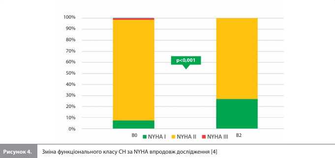 Результати КПНТ показали зменшення кутового коефіцієнта VE/VCO2 як за абсолютним значенням, так і у відсотках від прогнозованого значення, і при цьому відсутність істотних змін пікового споживання кисню (VO2max) та інших параметрів КПНТ, що визначаються на основі VO2, за 6 місяців лікування (табл. 2, рис. 3). Зменшення кутового коефіцієнта VE/VCO2 не корелювало зі збільшенням рівня Hb (коефіцієнт кореляції R2 між ΔVE/VCO2 і ΔHb становив 0,029). Аналіз оцінок, отриманих за допомогою KCCQ, не виявив поліпшення суб'єктивного сприйняття ЯЖ. Ані загальний бал, ані бали за окремими доменами, отримані через 6 місяців лікування, не демонстрували істотних відмінностей від вихідних значень (табл. 2) [4]. У 13 учасників зареєстровано покращення функціонального класу СН за Нью-Йоркською кардіологічною асоціацією (NYHA) (із II або III класу на В0 до I класу на В2) (p<0,001). Тільки в одного хворого спостерігалося збільшення класу NYHA з I до II (рис. 4) [4]. Результати BIVA були стабільними, без значущих розбіжностей між В0 і В2 (табл. 1). Водночас медіанний індекс MECKI значно знизився з 3,3% (діапазон 1,9–8,0) на В0 до 2,8% (діапазон 1,2–5,7) на В2, що свідчить про позитивний вплив досліджуваної терапії на 2-річний прогноз учасників (p<0,001) (табл. 3) [4]. Оцінки безпеки продемонстрували відмінну переносимість дапагліфлозину без розвитку істотних побічних ефектів [4].