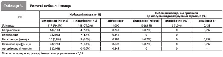 Висновки Загалом попри те що через невеликий об'єм вибірки учасників дослідження EARLIER не вдалося достовірно довести прогностичні переваги ранньої терапії еплереноном у пацієнтів із ГСН, його результати, а саме зниження частоти подій вторинної кінцевої точки – комбінації смерті від СС причин і госпіталізації з приводу СН – у групі еплеренону все ж таки свідчать про наявність потенційних переваг у подібної терапії та доцільність проведення додаткових досліджень. Подальшу оцінку цієї стратегії підтримує зіставна частота небажаних явищ у групах еплеренону й плацебо, а також ідентичність профілю побічних ефектів еплеренону (включно з гіперглікемією) його профілям безпеки в інших дослідженнях при СН.