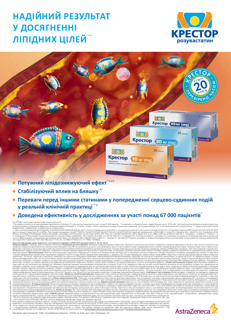 Висновок Отже, у великій когорті реальних пацієнтів із дисліпідемією, але без нещодавніх СС подій, які вперше почали отримувати терапію стандартними дозами аторвастатину, розувастатину, симвастатину або правастатину й приймали статини впродовж у середньому 55 тижнів, частота ССЗ була найменшою в пацієнтів, які приймали розувастатин. Після коригування з урахуванням факторів СС ризику ризик ССЗ на тлі терапії розувастатином був на 28% нижчим, ніж у сукупній когорті пацієнтів, які приймали інші досліджувані статини.