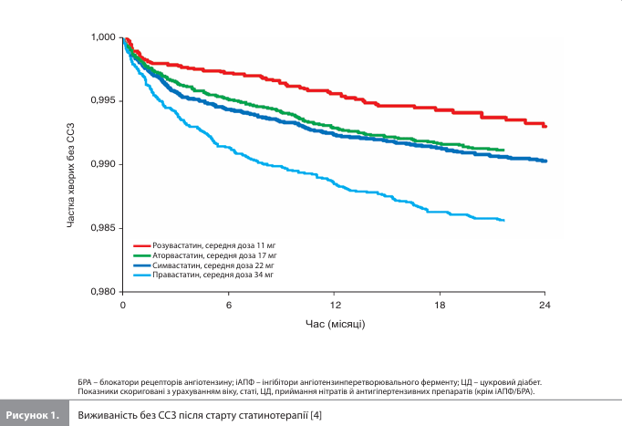 Обговорення результатів дослідження Heintjes et al. Представлене ретроспективне спостережне дослідження демонструє, що в умовах реальної клінічної практики в пацієнтів, які приймали розувастатин, реєстрували найнижчу частоту ССЗ, порівняно з пацієнтами, які приймали аторвастатин, симвастатин або правастатин (статини перелічені в порядку зростання частоти ССЗ). Після коригування з урахуванням факторів СС ризику, що були різними в групах, які приймали різні статини, приймання розувастатину асоціювалося зі зниженням ризику ССЗ на 28% порівняно із застосуванням інших статинів сукупно, а також на 29% порівняно з прийманням симвастатину й на 40% порівняно з прийманням правастатину. Отримані результати узгоджуються з даними про відносне зниження рівнів ХС ЛПНЩ на тлі використання кожного з досліджуваних статинів. Так, в іншому дослідженні, проведеному авторами на цій самій когорті пацієнтів, виявилося, що за середнього вихідного рівня ХС ЛПНЩ 4,3 ммоль/л найбільше зниження показника спостерігали в групі розувастатину (48%), за ним слідували аторвастатин (42%), симвастатин (39%) і правастатин (32%) [5], що відповідає результатам більш ранніх контрольованих і спостережних досліджень [6–8]. Водночас, на думку Heintjes et al., спостережувані відмінності між ефектами статинів на СС кінцеві точки також можуть пояснюватися проявом у більш ефективних статинів плейотропних властивостей, включно з протизапальними ефектами, а також ефектами, які стабілізують атеросклеротичну бляшку [4]. Це припущення підтримують результати дослідження JUPITER (Justification for the Use of Statins in Prevention: an Intervention Trial Evaluating Rosuvastatin), у якому серед пацієнтів із початково підвищеним рівнем С-реактивного білка й нормальним рівнем ліпідів уже через кілька місяців досліджуваної терапії (розувастатин vs плацебо) стала очевидною міжгрупова різниця за сукупною частотою СС подій на користь розувастатину [9]. Загалом, отримані результати дають змогу припустити, що навіть при застосуванні звичайних доз потужніші статини (розувастатин і аторвастатин), очевидно, мають більш виражений вплив на ризик СС подій у пацієнтів без нещодавніх епізодів ССЗ, аніж симвастатин і правастатин, упродовж перших двох років після початку статинотерапії [4]. До обмежень свого дослідження автори віднесли порівняно невелику тривалість спостереження, а також імовірну наявність неврахованих факторів СС ризику (що характерно для ретроспективних досліджень), а до переваг – пряме порівняння клінічних ефектів чотирьох статинів у широкій реальній вибірці пацієнтів різного віку й статі з дисліпідемією, а також узгодженість одержаних результатів із даними з попередніх досліджень [4].