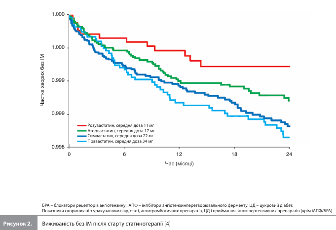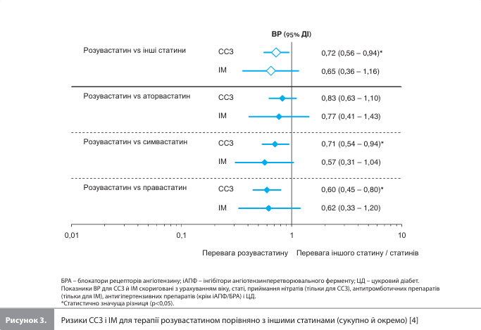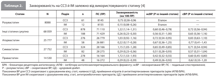 За період спостереження було зареєстровано 939 ССЗ, зокрема 200 ІМ (21%), 312 госпіталізацій з приводу хронічної ІХС (33%) і 427 інсультів (45%). Також були зареєстровані 53 випадки внутрішньолікарняної смерті (табл. 2). За розподілом ІМ, ІХС і інсультів групи статинів були подібними одна до одної, проте криві Каплана-Мейєра показують, що найнижчу частоту ССЗ загалом та ІМ зокрема спостерігали в групі розувастатину (рис. 1, 2). Показники захворюваності на ССЗ та ІМ відповідно варіювалися в діапазоні від 0,75 і 0,15 на 100 ЛР у групі розувастатину до 1,72 і 0,29 на 100 ЛР у групі правастатину. Після коригування з урахуванням модифікаторів ефекту в пацієнтів, які приймали розувастатин, спостерігали нижчу частоту ССЗ, ніж у пацієнтів, які приймали будь-які інші досліджувані статини (ВР 0,72; 95% ДІ 0,56–0,94), а також у пацієнтів із групи симвастатину (ВР 0,71; 0,54–0,94) і пацієнтів із групи правастатину (ВР 0,60; 95% ДІ 0,45–0,80) (табл. 2, рис. 3) [4].