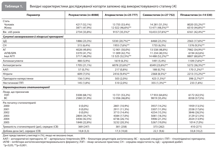 Методологія дослідження Heintjes et al. Джерелом даних для цього дослідження стала голландська система PHARMO, що дає змогу зв'язати інформацію про відпуск лікарських препаратів в аптеках із даними про госпіталізацію для понад 3 млн осіб, які на момент проведення дослідження становили близько 12% населення Нідерландів. З огляду на структуру системи PHARMO і принципи реалізації ліків через аптеки, отримана вибірка була репрезентативною для всього населення країни. Крім того, повна компенсація витрат на придбання статинів медичною страховкою і абсолютна обов'язковість медичного страхування в Нідерландах усували ризик спотворення результатів під впливом відмінностей у статусі зайнятості, типі медичної страховки або фінансовому стимулюванні пацієнтів. Аптечні записи містили інформацію про назву препарату, спеціальність лікаря, який виписав рецепт, дату видачі, видану кількість, призначений режим дозування і давали змогу обчислити приблизну тривалість застосування статину. Лікарняні записи містили детальну інформацію про діагнози, проведені процедури, дати госпіталізації, виписки або (у відповідних випадках) внутрішньолікарняної смерті [4]. До досліджуваної вибірки включали пацієнтів віком 18 років і старших, які вперше розпочали приймання статину (розувастатин, аторвастатин, симвастатин, правастатин або флувастатин) упродовж періоду від 1 січня 2000 р. до 30 вересня 2005 р. Дата першої видачі статинів у цей період була датою початку спостереження. Пацієнтів, які протягом року до цієї дати перенесли госпіталізацію з приводу ішемічної хвороби серця (ІХС; включно із черезшкірним коронарним втручанням), цереброваскулярного захворювання (включно із черезшкірною ангіопластикою сонної артерії) або хвороби периферичних артерій, до вибірки не включали. Спостереження припиняли через 2 роки від його початку, або після переїзду чи смерті пацієнта, або 31 грудня 2005 р., або після закінчення першого курсу лікування початково призначеним статином, або в день реєстрації клінічної кінцевої точки (використовували найраніший із цих моментів). Максимальна тривалість спостереження становила два роки [4]. Набір вихідних характеристик учасників дослідження включав стать, вік, супутні захворювання і супутню терапію. Із супутніх захворювань інтерес представляли серцева недостатність, цукровий діабет і артеріальна гіпертензія; із лікарських препаратів – антиаритміки, нітрати, препарати наперстянки, антикоагулянти, антиагреганти і нестатинові гіполіпідемічні препарати. Із відомостей про видачу / застосування статинів витягували такі дані: рік призначення, спеціальність лікаря, який виписав перший препарат (лікар загальної практики або вузький спеціаліст), доза й тривалість приймання статину [4]. Як первинну СС кінцеву точку автори обрали госпіталізацію з приводу ІМ, хронічної ІХС або інсульту, зокрема з проведенням коронарної або каротидної реваскуляризації (сукупно – ССЗ). Вторинною кінцевою точкою була госпіталізація з приводу ІМ. В аналіз включали події, що відбулися під час першого епізоду лікування статинами. Для кожного статину, а також для аторвастатину, симвастатину, правастатину й флувастатину в сукупності розраховували показники захворюваності на ССЗ та ІМ (кількість подій на 100 людино-років [ЛР]) із 95% довірчими інтервалами (ДІ). Далі резу