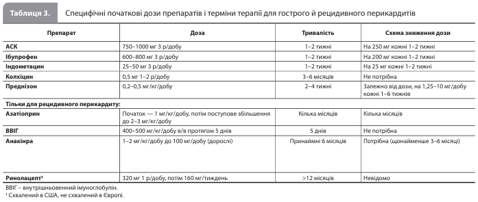 Варіанти лікування Нефармакологічний підхід до лікування ЗМПС передбачає обмеження фізичної активності до рівня, що відповідає малорухливому способу життя, аж до зникнення симптомів, досягнення клінічної ремісії та нормалізації концентрацій маркерів запалення. При міокардиті із систолічною дисфункцією ЛШ або СН для подолання симптомів і поліпшення функції ЛШ робоча група рекомендує дотримуватися рекомендацій ESC щодо ведення СН. При неускладненому гострому міокардиті з болем у грудях для контролю болю пропонується призначення ацетилсаліцилової кислоти (АСК) або нестероїдних протизапальних препаратів (НПЗП). Безпека такого підходу підтверджується результатами невеликого клінічного дослідження. При міоперикардиті слід розглядати НПЗП (у комбінації з інгібіторами протонної помпи, ІПП) для зменшення вираженості симптомів і супутнє застосування колхіцину – для зниження ризику рецидиву (IIa). Для контролю симптомів і профілактики аритмій у пацієнтів із гострим міокардитом, особливо при підвищеному рівні тропоніну, слід розглянути призначення бета-адреноблокаторів курсом на 6 або більше місяців (IIa) (невелике дослідження виявило зв'язок такої терапії зі зменшенням ризику серцевої смерті або трансплантації серця внаслідок міокардиту). Для стабілізації стану пацієнтів із фульмінантним неінфекційним міокардитом слід розглянути застосування кортикостероїдів (IIa). Рутинне призначення імуносупресивної терапії при гострому міокардиті зі збереженою фракцією викиду (ФВ) ЛШ не рекомендується через відсутність у такої терапії доведеного сприятливого прогностичного ефекту (III). При перикардиті (табл. 3) для контролю симптомів і зниження частоти рецидивів як терапію першої лінії рекомендують високі дози АСК або НПЗП з ІПП, а для зниження ризику рецидивів до АСК/НПЗП або кортикостероїдів рекомендується додавати колхіцин (I). Власне кортикостероїди доцільно призначати для контролю симптомів і зниження ризику рецидивів перикардиту тільки у разі, якщо АСК/НПЗП і колхіцин неефективні або протипоказані, або за наявності особливих показань (IIа). При рецидивному перикардиті (якщо терапія першої лінії та кортикостероїди неефективні) і підвищеному рівні С-реактивного білка рекомендується використовувати блокатори інтерлейкіну (ІЛ)-1, наприклад анакінру або рилонацепт, для зниження ризику рецидивів і створення умов для скасування кортикостероїдів (I). Як інтервенційний метод лікування пацієнтів із міокардитом і гемодинамічними порушеннями потрібно обговорювати перехід до механічної підтримки кровообігу (I), а пацієнтам із перикардитом і тампонадою серця, з підозрою на неопластичний або бактеріальний перикардит чи із симптоматичним помірним або значним перикардіальним випотом, попри медикаментозну терапію, рекомендується перикардіоцентез (I). У пацієнтів із перикардіальним випотом за неможливості проведення черезшкірного перикардіоцентезу або за наявності гнійного випоту рекомендується хірургічне дренування перикарда для видалення випоту й профілактики стиснення серця (I). У разі рецидивів перикардіального випоту на тлі медикаментозної терапії рекомендується хірургічне формування плевро-перикардіального вікна (I).