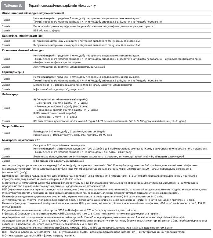 Специфічні варіанти ЗМПС: міокардити (табл. 5) Гігантоклітинний міокардит (ГКМ) – рідкісне захворювання, яке швидко прогресує, з високими 3-річними показниками смертності та трансплантації серця. У пацієнтів із підозрою на ГКМ унаслідок наявності таких проявів, як de novo СН тривалістю до 2 тижнів у поєднанні з нормальним або розширеним ЛШ, шлуночковими аритміями, що виникли вперше, атріовентрикулярною (АВ) блокадою другого або третього ступеня або відсутністю ефекту від стандартної терапії впродовж 1–2 тижнів, із метою підтвердження ГКМ і початку специфічної комбінованої імуносупресивної терапії рекомендується проводити ЕМБ (I).