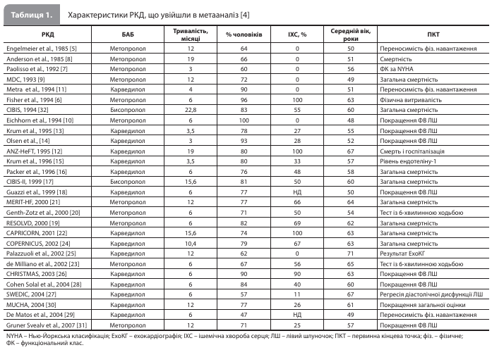 Методологія метааналізу Yong-Ming et al. Пошук клінічних досліджень, що відповідали критеріям включення в метааналіз, проводився шляхом перегляду бібліографії оглядових статей по СН і бібліографічного пошуку в базі даних MEDLINE. Для включення в аналіз підходили принаймні 3-місячні плацебо-контрольовані паралельно-групові рандомізовані клінічні дослідження (РКД) БАБ, рекомендованих до використання при СН (на момент проведення аналізу – 2012 р., це були карведилол, метопролол і бісопролол), у яких для оцінки смертності використовувався підхід intention-to-treat (тобто в аналізі враховувався препарат, призначений при рандомізації в дослідженні). Для цілей аналізу використовували такі визначення: раптова смерть – смерть, що настала протягом години без попереднього прогресування симптомів СН; смерть від серцево-судинних (СС) причин – смерть, що настала внаслідок прогресуючого погіршення перебігу СН, гострого набряку легенів або кардіогенного шоку; смерть від будь-якої причини – будь-яка смерть, що настала протягом періоду спостереження. Аналізували такі дані: вік, стать пацієнтів, середня ФВ лівого шлуночка (ЛШ), етіологія (ішемічна або неішемічна) СН, супутні лікарські препарати, середній час спостереження, випадки госпіталізації, усі випадки смерті, випадки СС смерті та раптової смерті. Загальна смертність була первинною кінцевою точкою метааналізу. Результати були представлені у вигляді відносних ризиків (ВР) і 95% довірчих інтервалів (ДІ). Для оцінки ступеня гетерогенності даних із різних досліджень використовували критерій Χ2.