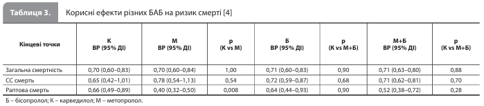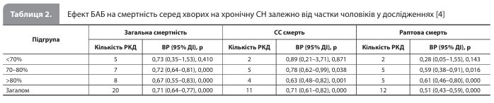 Аналіз випадків смерті показав такі результати. Загалом померло 1677 пацієнтів: 702 (9,24%) із 7594, які отримували БАБ, і 974 (13,46%) із 7235, які отримували плацебо (ВР 0,71, 95% ДІ 0,64–0,77). Це відповідає 1 смерті, якій вдалося запобігти, на кожних 24 пацієнти, що отримували БАБ протягом медіанного періоду 6 місяців. У 14 дослідженнях спостерігалася тенденція до зниження смертності, і тільки в 5 – статистично значуще зниження показника [4]. Інформація про смерть від СС причин була отримана з 18 досліджень: частота СС смерті становила 7,60% (464 з 6106 пацієнтів) у групі БАБ і 11,14% (647 з 5808 пацієнтів) у групі плацебо (ВР 0,71, 95% ДІ 0,61–0,82). Це відповідає 1 СС смерті, якій вдалося запобігти, на кожних 29 пацієнтів, що отримували БАБ протягом медіанного періоду 6 місяців [4]. Інформація про раптову серцеву смерть була отримана з 21 дослідження: частота раптової смерті становила 3,65% (232 з 6364 пацієнтів) у групі БАБ і 7,44% (448 з 6019 пацієнтів) у групі плацебо (ВР 0,51, 95% ДІ 0,43–0,59). Це відповідає 1 раптовій смерті, якій вдалося запобігти, на кожних 26 пацієнтів, що отримували БАБ протягом медіанного періоду 6 місяців [4]. Щоб оцінити вплив частки учасників-чоловіків на зміну ризиків будь-якої, СС та раптової смерті під впливом БАБ у РКД, автори розділили дослідження, включені в метааналіз, на 3 підгрупи з частками чоловіків <70, 70–80 і >80% відповідно, після чого провели окремий аналіз досліджуваних видів смертності. У результаті було виявлено, що величина й значимість сприятливого ефекту БАБ на смертність, зареєстрованого в дослідженнях хронічної СН, збільшувалися зі збільшенням частки чоловіків у РКД. Зокрема, у підгрупі «>80%» і підгрупі «70–80%» БАБ значно знижували смертність (загальну, СС, раптову) порівняно з плацебо; розміри ефектів БАБ в цих підгрупах РКД були зіставними. При цьому в підгрупі РКД «<70%» спостерігалася лише тенденція до зниження всіх видів смертності порівняно з плацебо, і хоча ВР для раптової смерті на тлі приймання БАБ у цій підгрупі було досить низьким (ВР 0,28, 95% ДІ 0,05–1,55), 95% ДІ був широким і відмінність від плацебо не була статистично значущою (р=0,143) (табл. 2) [4]. Аналіз смертності з урахуванням використовуваного БАБ показав такі результати. Усі три БАБ – карведилол, метопролол і бісопролол – знижували загальну смертність однаково й статистично значуще (ВР 0,70, 95% ДІ 0,60–0,83; ВР 0,70, 95% ДІ 0,60–0,84 і ВР 0,71, 95% ДІ 0,60–0,83 відповідно). Усі три БАБ значно знизили частоту раптової смерті (ВР 0,66, 95% ДІ 0,49–0,89; ВР 0,40, 95% ДІ 0,32–0,50 і ВР 0,64, 95% ДІ 0,44–0,93 для карведилолу, метопрололу й бісопрололу відповідно). Із цих трьох БАБ метопролол мав більш виражений ефект у зменшенні раптової смерті порівняно з карведилолом або бісопрололом (табл. 3) [4].
