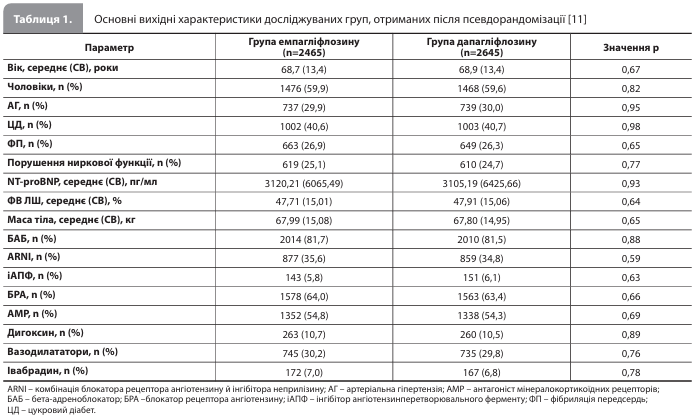 Результати дослідження Bu et al. Аналіз бази даних CDW привів до виявлення 6964 пацієнтів, що відповідали критеріям включення; із цієї вибірки після псевдорандомізації отримано когорту, що складалася з 4930 пацієнтів (по 2465 пацієнтів у групах дапагліфлозину й емпагліфлозину; 2944 чоловіки [59,7%] і 1986 жінок [40,3%]; середній [СВ] вік – 68,8 [13,4] року; середня [СВ] тривалість лікування – 12,13 [10,41] місяця). Групи були добре збалансовані за вихідними характеристиками (табл. 1) [11]. Після стратифікації з урахуванням вихідної ФВ ЛШ були отримані три підгрупи – СНзнФВ, СНпзнФВ і СНзбФВ (табл. 2) [11].