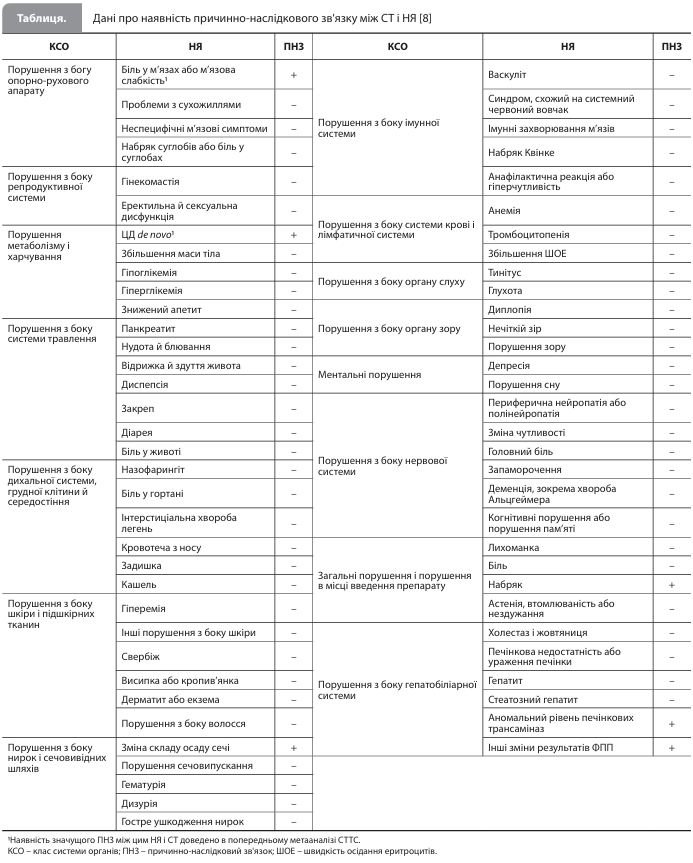 Реальний профіль безпеки статинів: результати нового аналізу зв’язку між терапією статинами й побічними ефектами з інструкцій щодо застосування препаратівРезюме. У статті представлено результати нового масштабного метааналізу рандомізованих досліджень статинів. Мета аналіз показав, що, крім раніше описаного зростання ризику м'язових симптомів і нових випадків цукрового діабету, статини пов'язані лише з незначним абсолютним ризиком погіршення результатів функціональних проб печінки, а також із ризиками зміни складу сечі та розвитку набряків невідомої клінічної значущості. Зв'язок між статинами та іншими 62 побічними ефектами, переліченими в інструкціях із застосування, не виявлений. У сучасній медицині гіполіпідемічна терапія статинами застосовується як основний компонент первинної та вторинної профілактики атеросклеротичних серцево-судинних (СС) захворювань у широкого кола пацієнтів. Підставою для використання такого підходу стали результати масштабних рандомізованих плацебо-контрольованих клінічних досліджень (РКД), які показали, що статинотерапія (СТ) знижує ризик серйозних судинних подій [1–5] без збільшення смертності від захворювань, не пов'язаних із судинами [1], або ризику розвитку ракових пухлин [6]. Розрахунки показали, що абсолютна користь у вигляді запобігання серйозним СС подіям від 5-річної ефективної СТ (наприклад, аторвастатином у дозі 40 мг на день) становить 10 і 5% для вторинної та первинної СС профілактики відповідно [7]. Основними встановленими побічними ефектами статинів є порушення з боку м'язів – міопатія (рідко, 1 випадок на 10 000 людино-років [ЛР]) і рабдоміоліз (дуже рідко, приблизно 2–3 випадки на 100 000 ЛР), а також менш виражені м'язові симптоми, частота реєстрації яких дещо (приблизно на 1%) збільшується протягом першого року лікування [8, 9]. Також раніше був доведений зв'язок між прийманням статинів і помірним дозозалежним збільшенням ризику de novo розвитку цукрового діабету (ЦД), яке, однак, переважно спостерігається серед осіб, що мали ознаки переддіабету до початку СТ [10]. Загалом, є підстави вважати, що доведена користь статинів для СС системи значно переважає відомі ризики СТ [8]. Проте дані досліджень, відмінних від РКД, і звіти, отримані в рамках післяреєстраційного спостереження за безпекою, свідчать, що на тлі приймання статинів відзначалося підвищення ризику низки інших побічних ефектів, таких як порушення функції печінки, депресія, порушення когнітивних функцій, порушення сну, гостре ураження нирок або ниркова недостатність, інтерстиціальне захворювання легень і панкреатит. Відомо, що такі фармакоепідеміологічні дані можуть бути корисними для виявлення рідкісних, але клінічно значущих побічних ефектів, однак на них не можна покладатися при оцінці причинно-наслідкового зв'язку між препаратом і більш поширеними в досліджуваній популяції небажаними явищами (НЯ) [7]. Тим не менш, численні НЯ, зареєстровані в ході цих спостережень, були зазначені в інструкціях щодо медичного застосування статинів у розділі «Побічні ефекти», що негативно впливає на оцінку пацієнтами й лікарями співвідношення «користь/ризик» СТ і підвищує ймовірність відмови від застосування або дострокового припинення приймання статинів із наслідками, потенційно небезпечними для життя та здоров'я. Наприклад, після публ