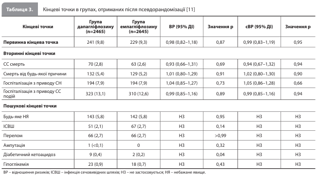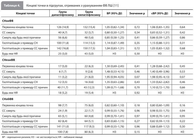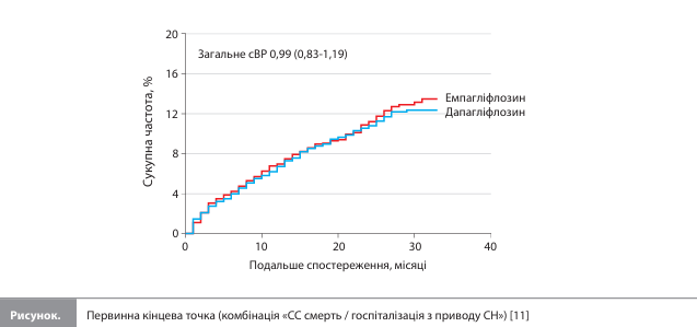 У кожній із трьох підгруп досліджувані групи не мали між собою істотних відмінностей за вихідними характеристиками, у тому числі за супутнім застосуванням науково обґрунтованої медикаментозної терапії. Водночас порівняння підгруп показало більшу частку пацієнтів літнього віку і жіночої статі в підгрупі СНзбФВ, а також значно частіше застосування інгібіторів рецепторів ангіотензину / неприлізину, інгібіторів ангіотензинперетворювального ферменту, блокаторів рецепторів ангіотензину й антагоністів мінералокортикоїдних рецепторів у підгрупі СНзнФВ порівняно з двома іншими підгрупами. За період проведення дослідження в учасників спостерігалося значне збільшення рівня креатиніну в сироватці й ФВ ЛШ, значне зменшення маси тіла та відсутність істотної зміни концентрації NT-proBNP відносно вихідного рівня без суттєвої різниці між групами лікування [11]. У когорті, отриманій після процедури псевдорандомізації, частота первинної кінцевої точки (комбінація «СС смерть / госпіталізація з приводу СН») після медіани (МКР) спостереження 16,0 (8,0–27,0) місяців становила 9,8% у групі дапагліфлозину й 9,3% у групі емпагліфлозину (скориговане відношення ризиків [сВР] 0,99, 95% довірчий інтервал [ДІ] 0,83–1,19, р=0,95) (табл. 3, рис.) [11]. Аналіз частоти вторинних кінцевих точок показав такі результати: СС смерть – 2,8 vs 2,6% (сВР 0,94, 95% ДІ 0,67– 1,32, р=0,94), смерть від будь-якої причини 5,4 vs 5,2% (сВР 1,02, 95% ДІ 0,80–1,30, р=0,90), госпіталізація з приводу СН 7,9 vs 7,9% (сВР 1,05, 95% ДІ 0,86–1,28, р=0,66), госпіталізація з приводу СС подій 13,1 vs 12,6% (сВР 0,99, 95% ДІ 0,85–1,16, р=0,94) у групах дапагліфлозину й емпагліфлозину відповідно (табл. 3) [11]. Аналіз у підгрупах, виділених з урахуванням ФВ ЛШ, також показав зіставні ризики первинної і вторинних кінцевих точок у групах дапагліфлозину й емпагліфлозину (р для взаємодії = 0,32; табл. 4). Пошуковий аналіз, проведений у підгрупі пацієнтів із СНпФВ (пацієнти в цій пошуковій підгрупі були молодші і рідше мали артеріальну гіпертензію, цукровий діабет або порушення функції нирок порівняно з підгрупою СНзнФВ), також показав подібні результати оцінки частоти кінцевих точок у групах емпагліфлозину й дапагліфлозину [11].