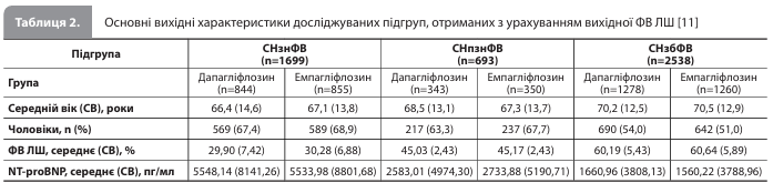 Результати дослідження Bu et al. Аналіз бази даних CDW привів до виявлення 6964 пацієнтів, що відповідали критеріям включення; із цієї вибірки після псевдорандомізації отримано когорту, що складалася з 4930 пацієнтів (по 2465 пацієнтів у групах дапагліфлозину й емпагліфлозину; 2944 чоловіки [59,7%] і 1986 жінок [40,3%]; середній [СВ] вік – 68,8 [13,4] року; середня [СВ] тривалість лікування – 12,13 [10,41] місяця). Групи були добре збалансовані за вихідними характеристиками (табл. 1) [11]. Після стратифікації з урахуванням вихідної ФВ ЛШ були отримані три підгрупи – СНзнФВ, СНпзнФВ і СНзбФВ (табл. 2) [11].